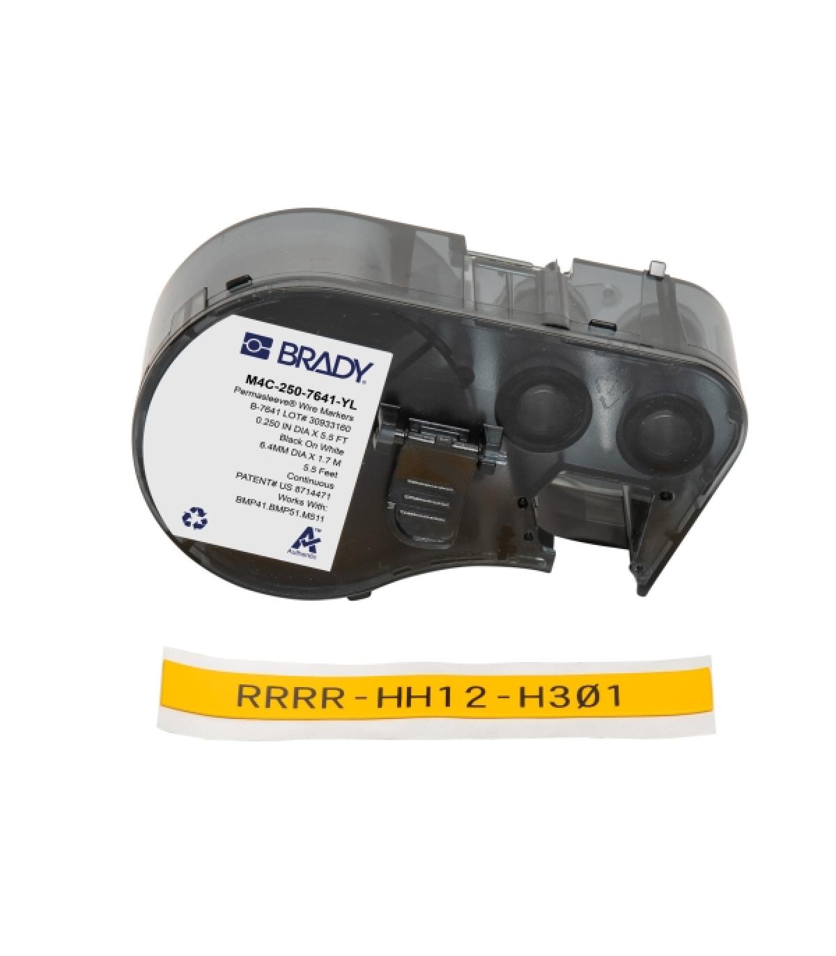 Marque permanentemente cables y alambres con el material de etiquetas de poliolefina B-7641, libre de halógenos y de baja emisión de humo. Predimensionado para adaptarse a la mayoría de los conjuntos de cables y alambres. Imprima con una impresora de etiquetas portátil Brady.