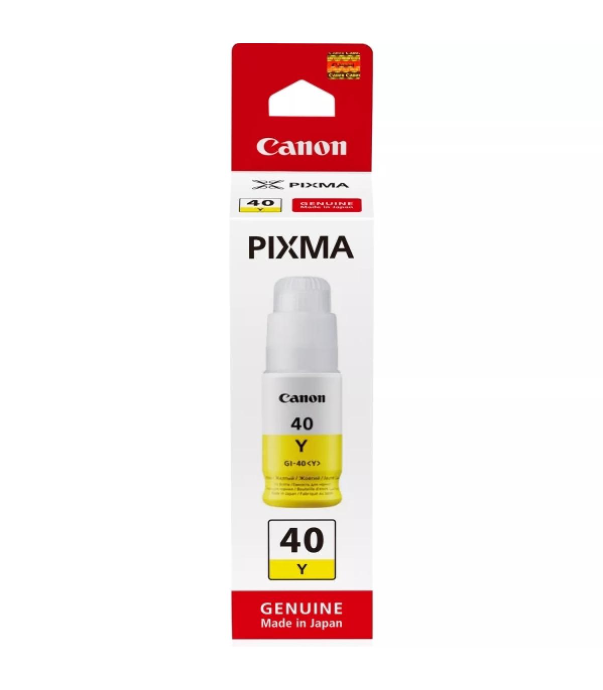 Botella de tinta original Canon GI40 (GI40Y/3402C001) de alta calidad. Adecuado para uso en las siguientes impresoras: Canon Pixma G 5040 Canon Pixma G 6040 Canon Pixma G 7040 Rendimiento: 7.700 Páginas