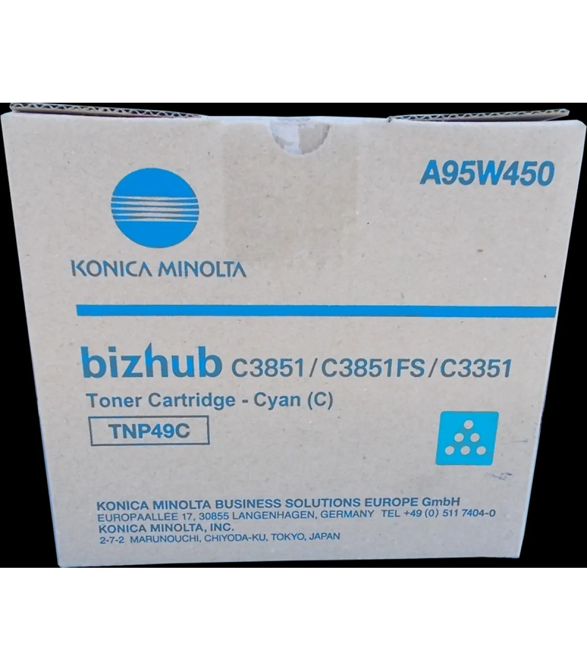 Cartucho de toner original Konica Minolta TNP49 (TNP49C/A95W450) de alta calidad. Adecuado para uso en las siguientes impresoras: Konica Minolta Bizhub C3351 Konica Minolta Bizhub C3851 Konica Minolta Bizhub C3851FS Rendimiento: 12.000 Páginas