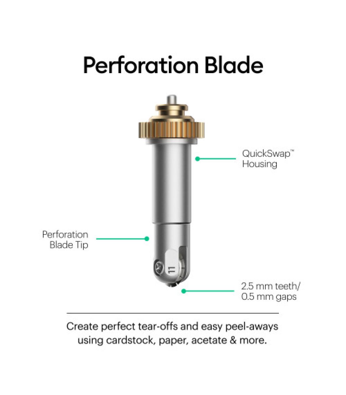El recambio o punta adicional para crear líneas de corte fáciles de rasgar. Esta Punta de Perforación, parte del sistema QuickSwap, corta líneas perforadas precisas en papel y cartulina. Perfecta para boletos de rifa, folletos o cualquier diseño que necesite una parte desprendible.