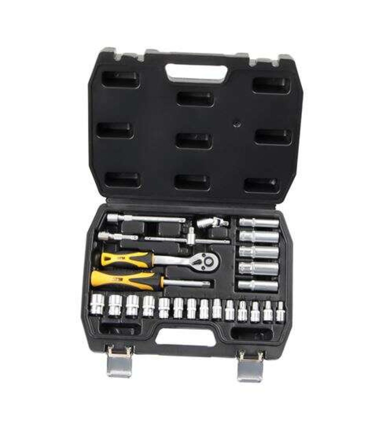 Las herramientas de 1/4 incluyen un total de 14 vasos de diferentes tamaños, que van desde 4mm hasta 14mm. También se incluyen 5 vasos largos de 8mm a 13mm. Además, se encuentra una chicharra de 72 dientes con expulsor de vasos, dos barras de extensión de 50mm y 100mm, una articulación universal, un mango corredizo y un mango destornillador. Estas herramientas son ideales para trabajos que requieran precisión y versatilidad en espacios reducidos.