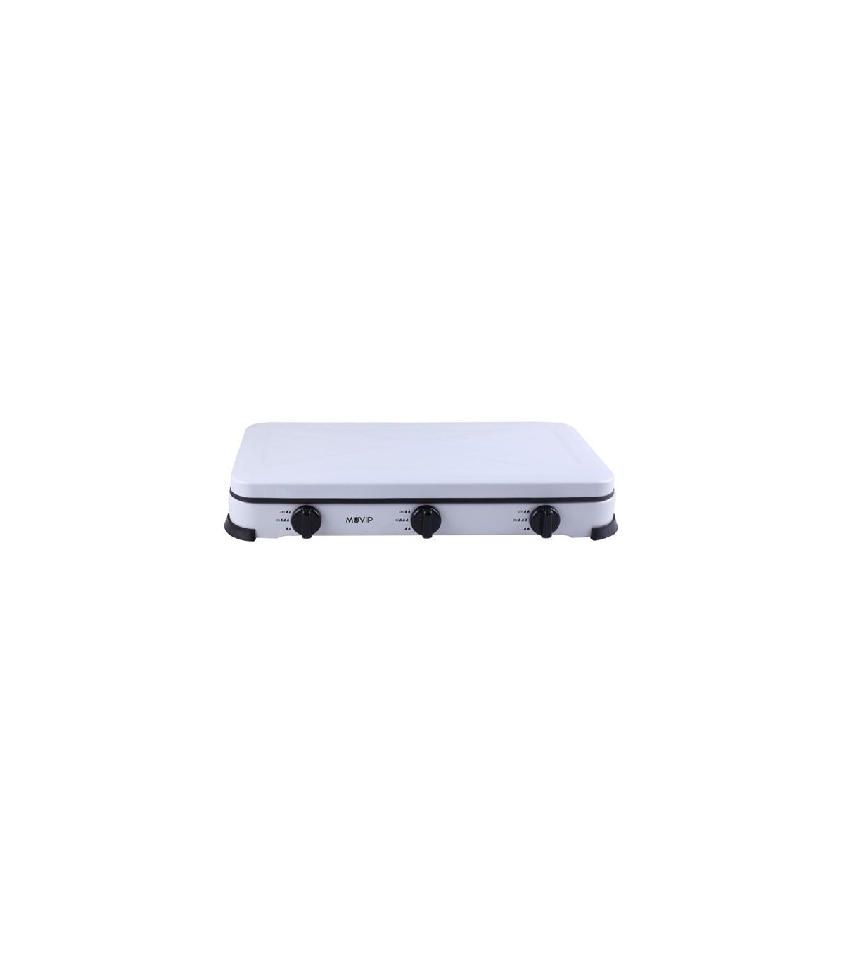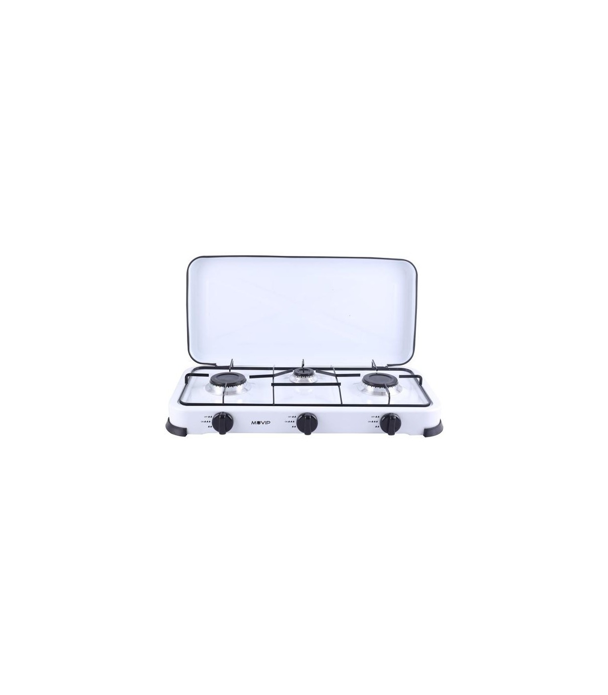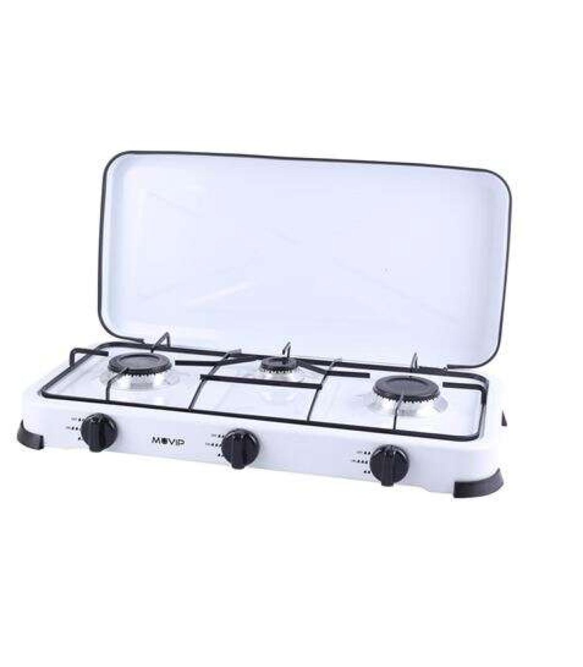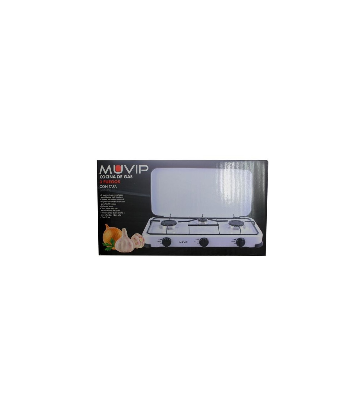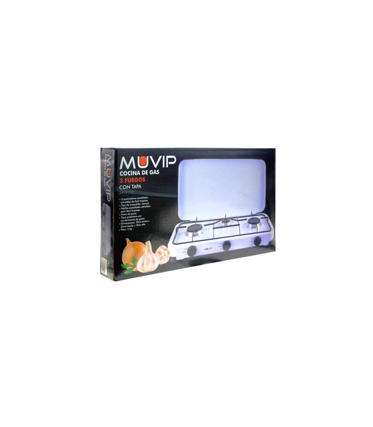 Muvip Cocina de Gas 3 Fuegos Especificaciones: -Quemadores esmaltados extraibles para fácil limpieza -Tipo de encendido: manual -Rejillas esmaltadas extraibles para fácil limpieza -Patas de goma -Tapa protectora con recubrimiento de goma -Dimensiones: 59cm ancho x 33cm fondo x 10cm alto -Peso: 3 kg
