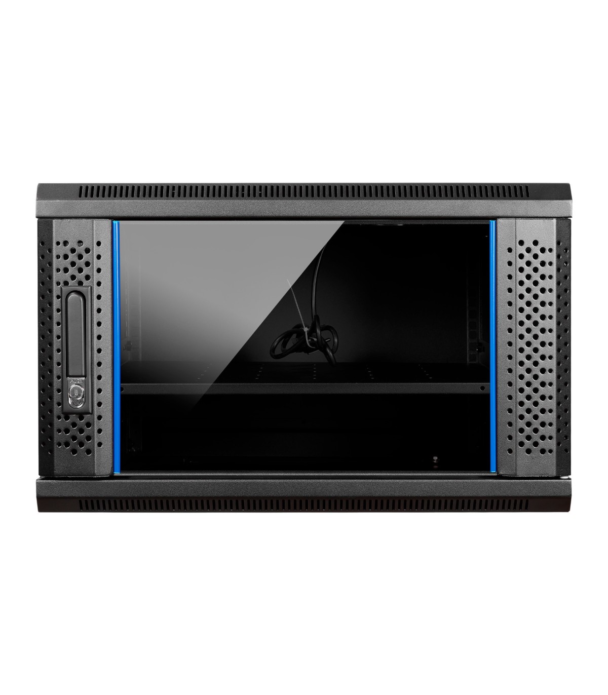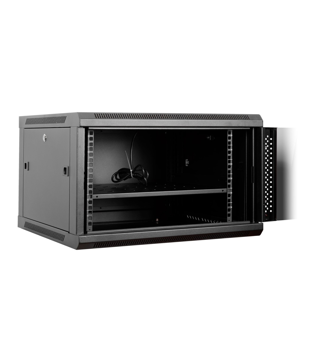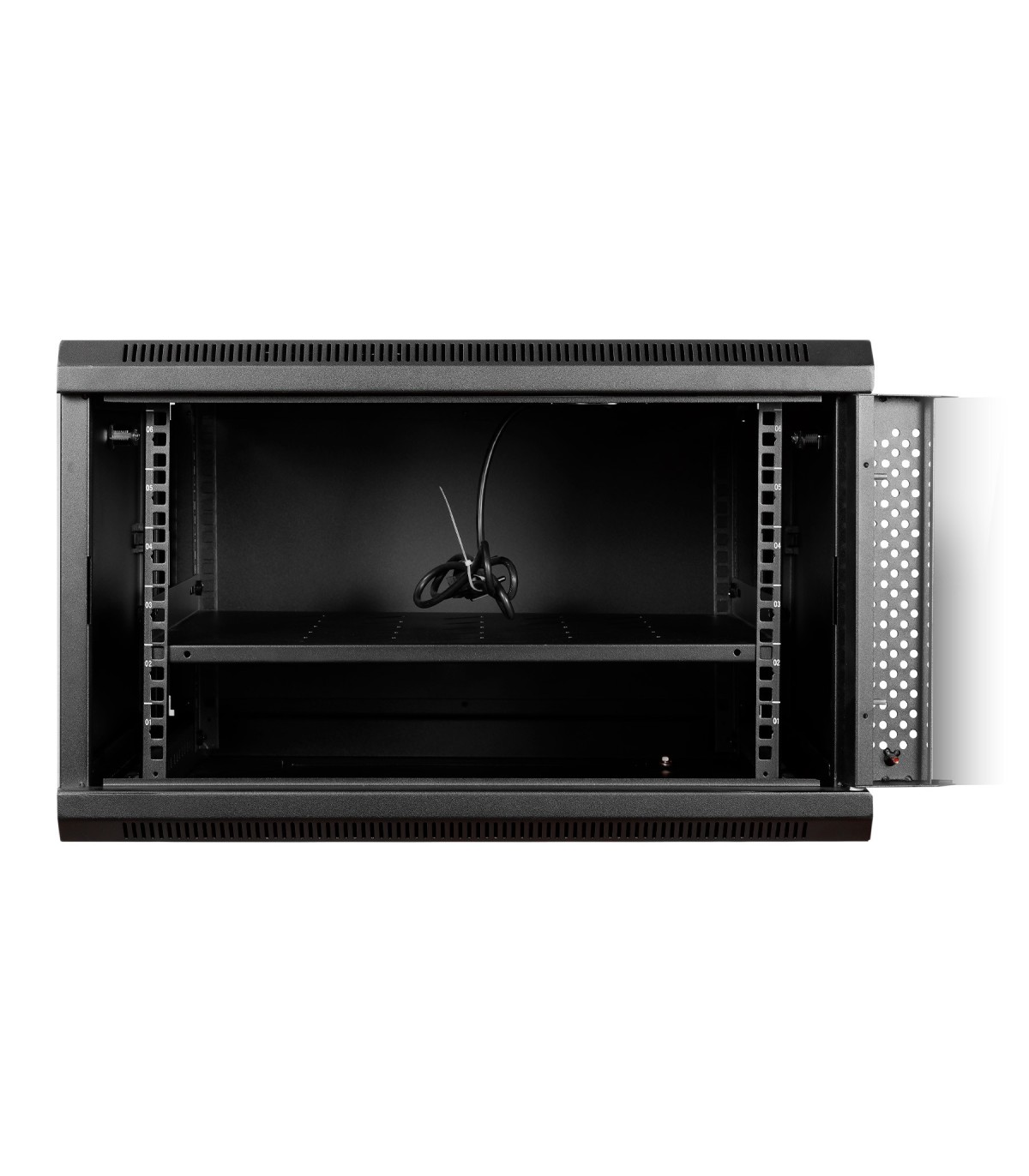 - Armario rack mural con ancho estándar de 19" (482,6 mm), con amplio espacio interior para componentes y cableado.