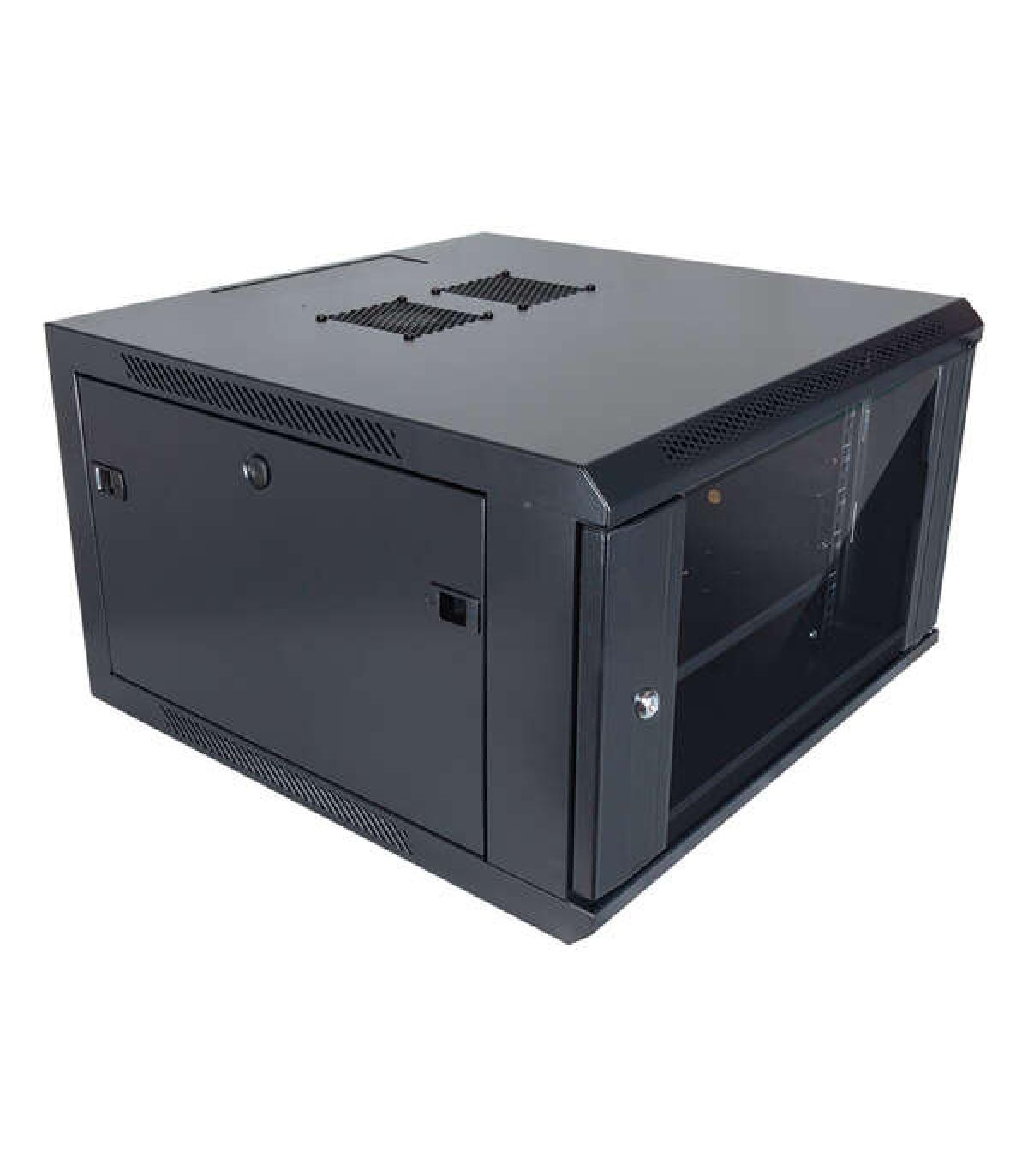 - Armario rack mural con ancho estándar de 19? (482,6 mm), con amplio espacio interior para componentes y cableado.