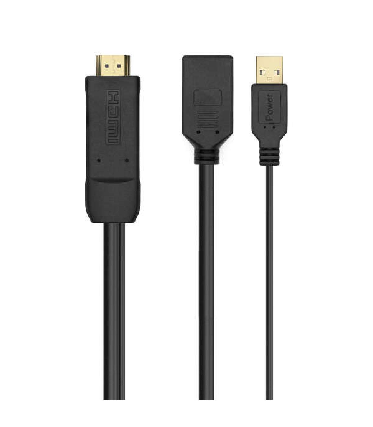 Conversor activo HDMI 2.0 a DISPLAYPORT 1.2 con conector HDMI macho, USB alimentación macho en un extremo y DISPLAYPORT hembra en el otro.