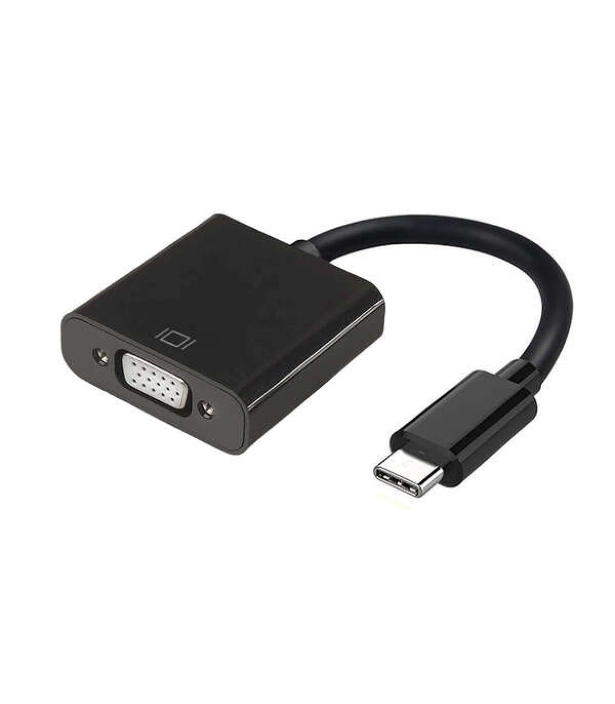 Conversor USB-C a VGA, con conector USB-C en un extremo y VGA hembra en el otro.
