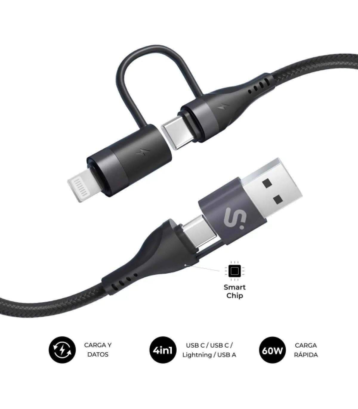 El SUBBLIM TOP 4 in 1 combina los cuatro conectores más usados (USB-A, USB-C y Lightning) para que cargues y sincronices prácticamente cualquier dispositivo actual sin necesidad de llevar varios cables.