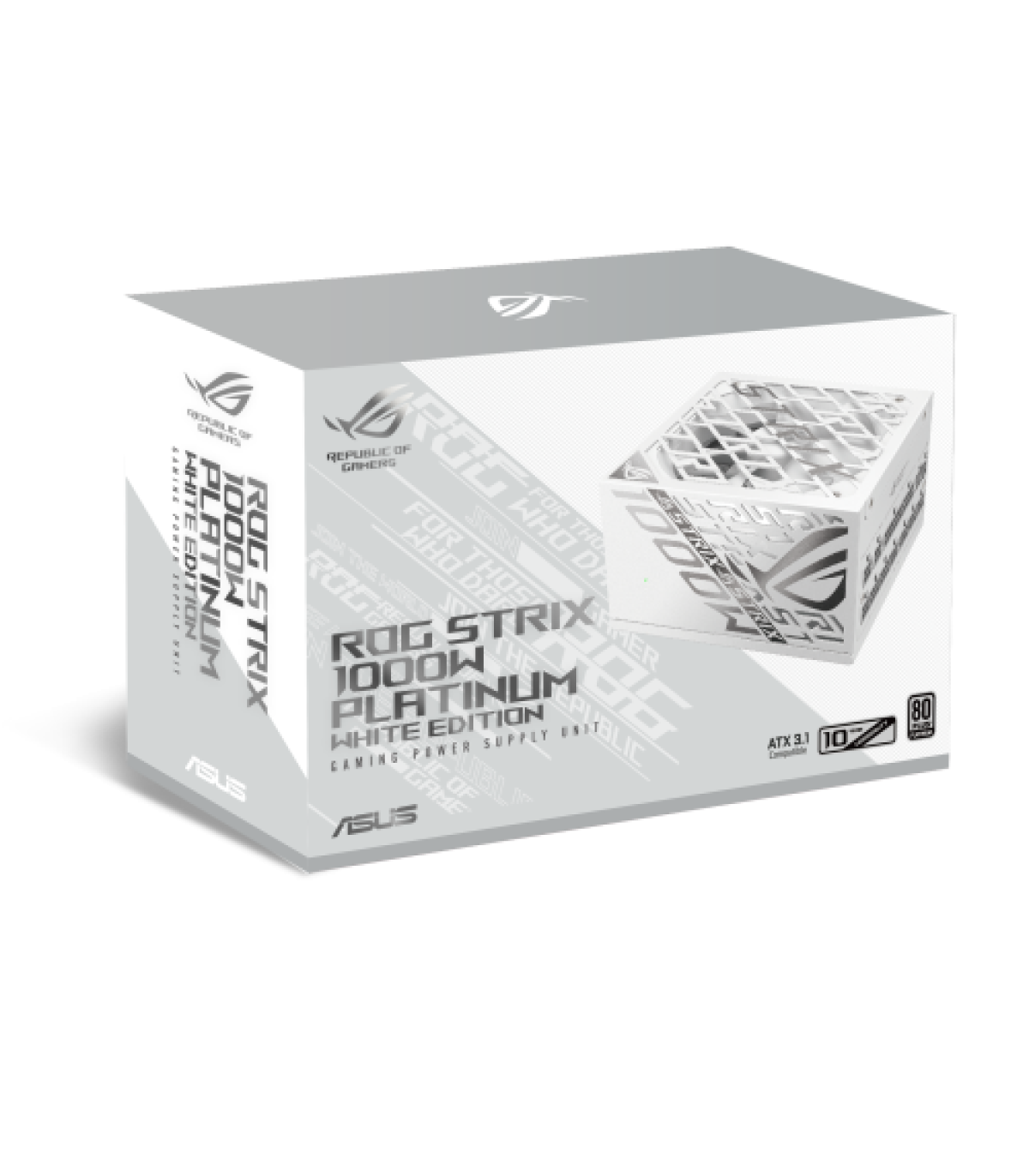 ASUS ROG -STRIX-1000P-GAMING-WHITE. Potencia total: 1000 W, Voltaje de entrada AC: 100 - 240 V, Corrección del factor de potencia tipo (PFC): Activo. Alimentador de energía para tarjeta madre: 20+4 pin ATX, Longitud del cable de alimentación de la placa base: 61 cm, Longitud del cable de alimentación SATA: 400,120 mm. Utilizar con: PC, Factor de forma de fuente de alimentación (PSU): ATX, Certificación 80 PLUS: 80 PLUS Platinum. Color del producto: Blanco, Tipo de enfriamiento: Activo, Número de ventiladores: 1 Ventilador(es). Cables incluidos: CPU, PCIe, SATA, Peripheral (Molex)