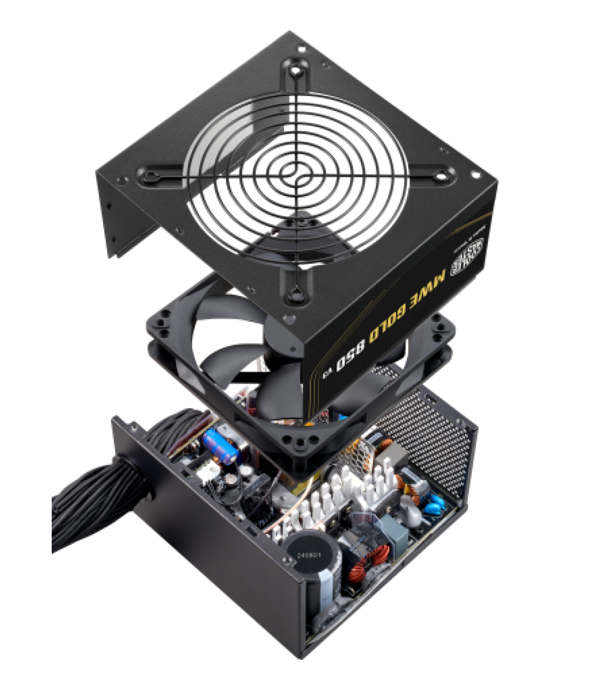 Cooler Master MWE GOLD 850 V3. Potencia total: 850 W, Voltaje de entrada AC: 100 - 240 V, Frecuencia de entrada AC: 50/60 Hz. Alimentador de energía para tarjeta madre: 24-pin ATX, Longitud del cable de alimentación de la placa base: 55 cm, Longitud del cable de alimentación SATA: 400,550,700 mm. Utilizar con: PC, Factor de forma de fuente de alimentación (PSU): ATX, Certificación 80 PLUS: 80 PLUS Gold. Color del producto: Negro, Tipo de enfriamiento: Activo, Diámetro de ventilador: 12 cm. Certificados de conformidad: BIS, BSMI, CCC, CE, EAC, Comisión Federal de Comunicaciones (FCC) de Estados Unidos, RCM, TÜV...