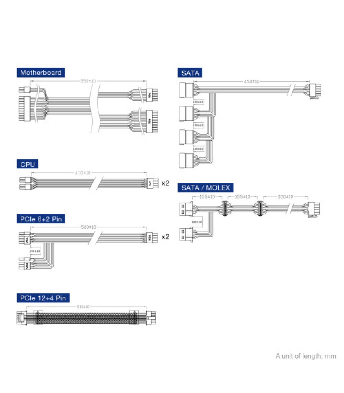- Longitud del cable de conectores de alimentación PCI Express (12+4 pines): 500 mm