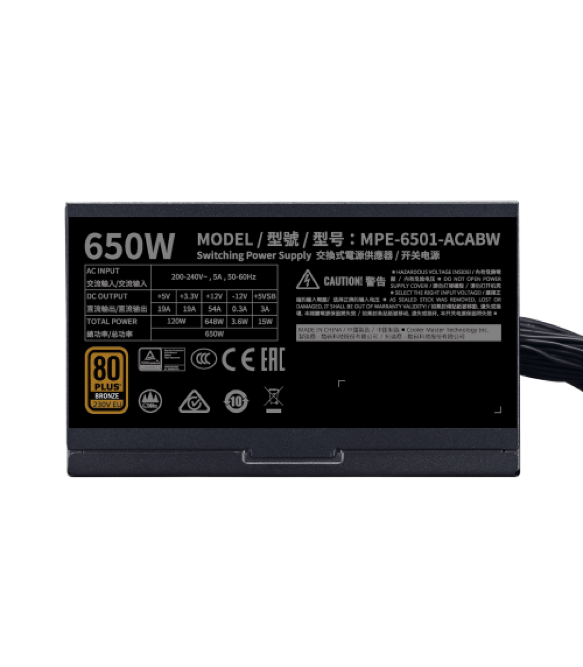 Cooler Master MWE 650 Bronze 230V V2. Potencia total: 650 W, Voltaje de entrada AC: 220 - 240 V, Frecuencia de entrada AC: 50/60 Hz. Alimentador de energía para tarjeta madre: 24-pin ATX, Tipo de cableado: No modular. Utilizar con: PC, Factor de forma de fuente de alimentación (PSU): ATX, Certificación 80 PLUS: 80 PLUS Bronze. Color del producto: Negro, Tipo de enfriamiento: Activo, Diámetro de ventilador: 12 cm. Ancho: 150 mm, Profundidad: 140 mm, Altura: 86 mm