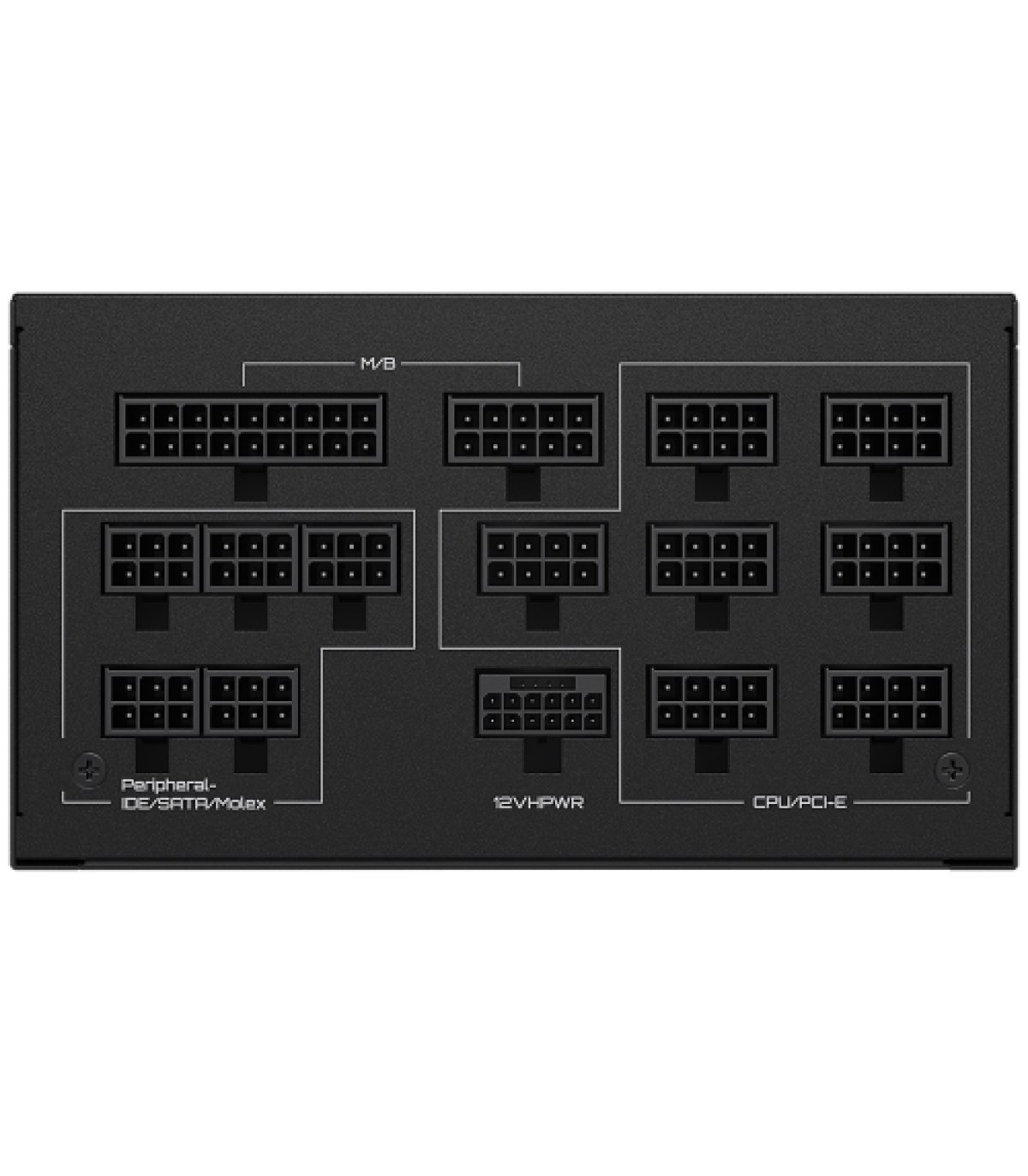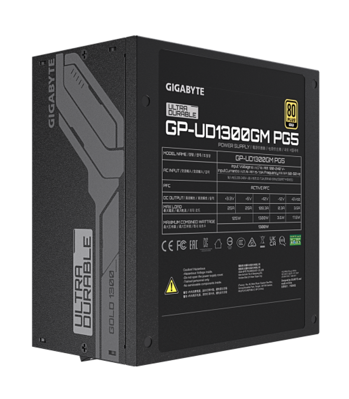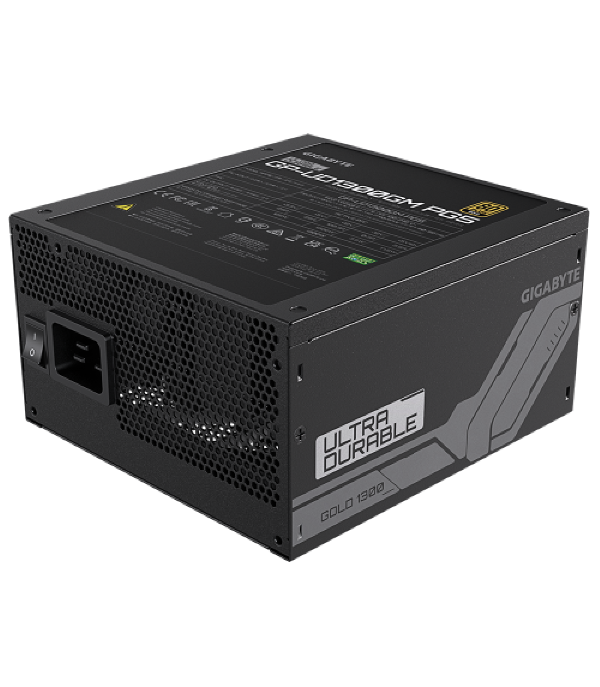 GIGABYTE UD1300GM PG5. Potencia total: 1300 W, Voltaje de entrada AC: 100 - 240 V, Frecuencia de entrada AC: 50 - 60 Hz. Alimentador de energía para tarjeta madre: 20+4 pin ATX, Longitud del cable de alimentación de la placa base: 61 cm, Longitud del cable de alimentación SATA: 150,600 mm. Utilizar con: PC, Factor de forma de fuente de alimentación (PSU): ATX, Certificación 80 PLUS: 80 PLUS Gold. Color del producto: Negro, Tipo de enfriamiento: Activo, Diámetro de ventilador: 12 cm. Cables incluidos: CPU, PATA, Peripheral (Molex), SATA