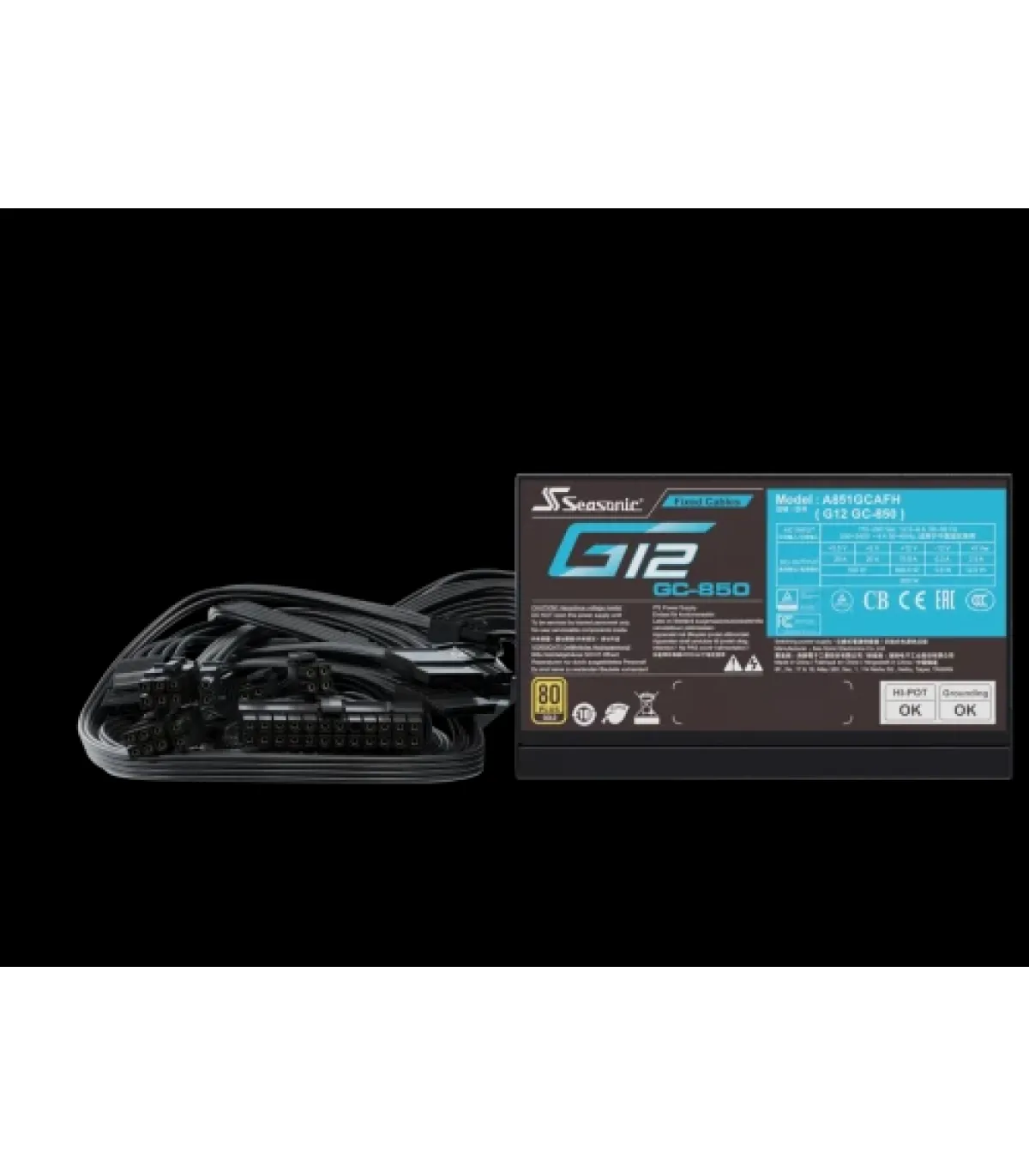 Seasonic Netzteil 850W G12 GC-850 80+Gold. Potencia total: 850 W, Voltaje de entrada AC: 100 - 240 V, Frecuencia de entrada AC: 50/60 Hz. Tipo de cableado: No modular. Utilizar con: PC, Factor de forma de fuente de alimentación (PSU): ATX, Certificación 80 PLUS: 80 PLUS Gold. Color del producto: Negro, Tipo de enfriamiento: Activo, Diámetro de ventilador: 12 cm. Cables incluidos: Corriente alterna, CPU, PCIe, SATA