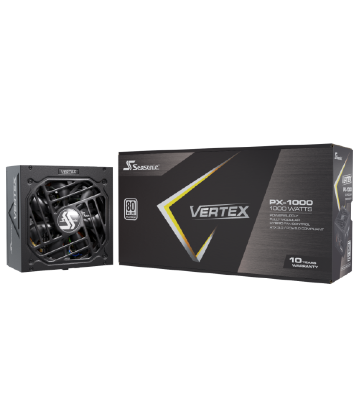 Seasonic VERTEX PX-1000. Potencia total: 1000 W, Voltaje de entrada AC: 100 - 240 V, Frecuencia de entrada AC: 50 - 60 Hz. Alimentador de energía para tarjeta madre: 24-pin ATX, Longitud del cable de alimentación de la placa base: 61 cm, Longitud del cable de alimentación SATA: 470,550,570,700,760,860,950 mm. Utilizar con: PC, Factor de forma de fuente de alimentación (PSU): ATX, Certificación 80 PLUS: 80 PLUS Platinum. Color del producto: Negro, Tipo de enfriamiento: Activo, Diámetro de ventilador: 13,5 cm. Cables incluidos: CPU, PCIe, Peripheral (Molex), SATA