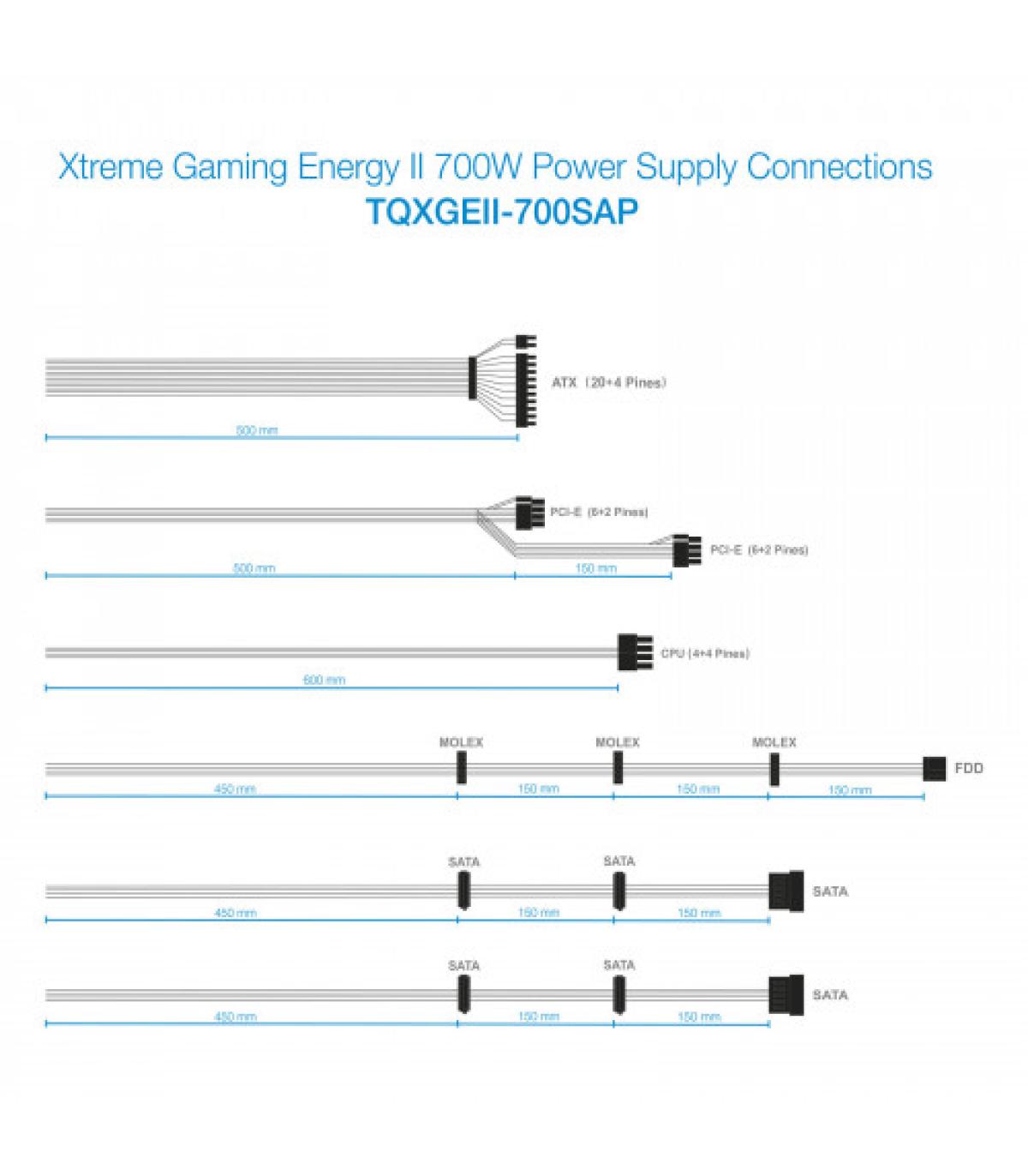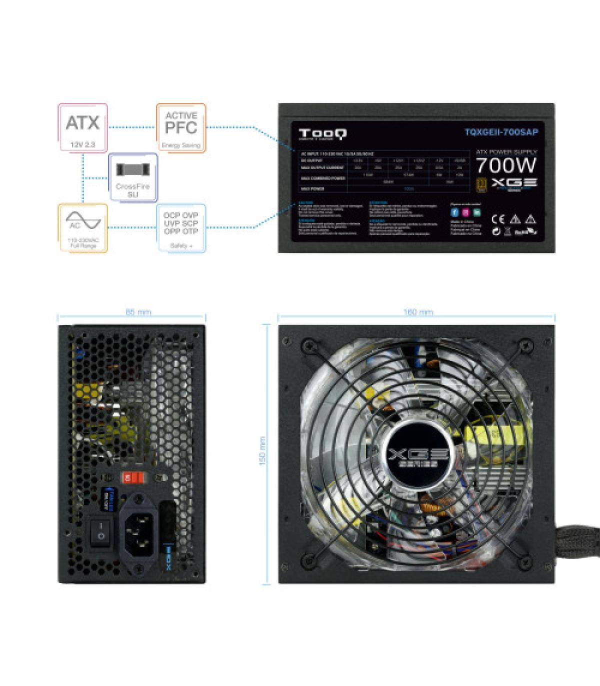 La serie gaming XGE II de TOOQ está diseñada para jugadores muy entusiastas y configuraciones exigentes. Esta serie de fuentes de alimentación de alto rendimiento lleva el certificado 80 PLUS BRONZE, por lo que se garantiza más del 82% de eficiencia. La poderosa salida +12V garantiza la alimentación de microprocesadores y GPU multi núcleos de última generación. Esta fuente incorpora un ventilador con luz LED azul APAGABLE para adaptar a las necesidades de cada usuario. El ventilador lleva rodamientos fabricados con doble cojinete de bolas, con lo cual tiene una vida útil exageradamente larga (más de 20 años de vida útil con uso de 10 horas diarias). Sabemos que los jugadores exigentes usan torres altas, por lo tanto, esta fuente incorpora cables extra largos y mallados para que los jugadores monten su equipo tranquilamente sin sorpresa. En conclusión, es el “corazón” potente y perfecto para empujar su súper configuración de equipo.