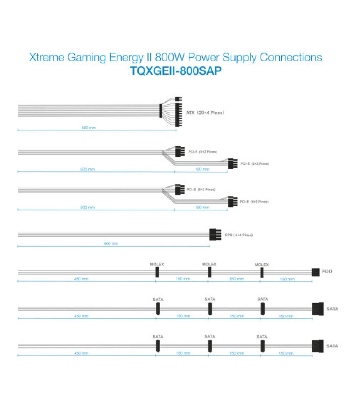 La serie gaming XGE II de TOOQ está diseñada para jugadores muy entusiastas y configuraciones exigentes. Esta serie de fuentes de alimentación de alto rendimiento lleva el certificado 80 PLUS BRONZE, por lo que se garantiza más del 82% de eficiencia. La poderosa salida +12V garantiza la alimentación de microprocesadores y GPU multi núcleos de última generación. Esta fuente incorpora un ventilador con luz LED azul APAGABLE para adaptar a las necesidades de cada usuario. El ventilador lleva rodamientos fabricados con doble cojinete de bolas, con lo cual tiene una vida útil exageradamente larga (más de 20 años de vida útil con uso de 10 horas diarias). Sabemos que los jugadores exigentes usan torres altas, por lo tanto, esta fuente incorpora cables extra largos y mallados para que los jugadores monten su equipo tranquilamente sin sorpresa. En conclusión, es el “corazón” potente y perfecto para empujar su súper configuración de equipo.