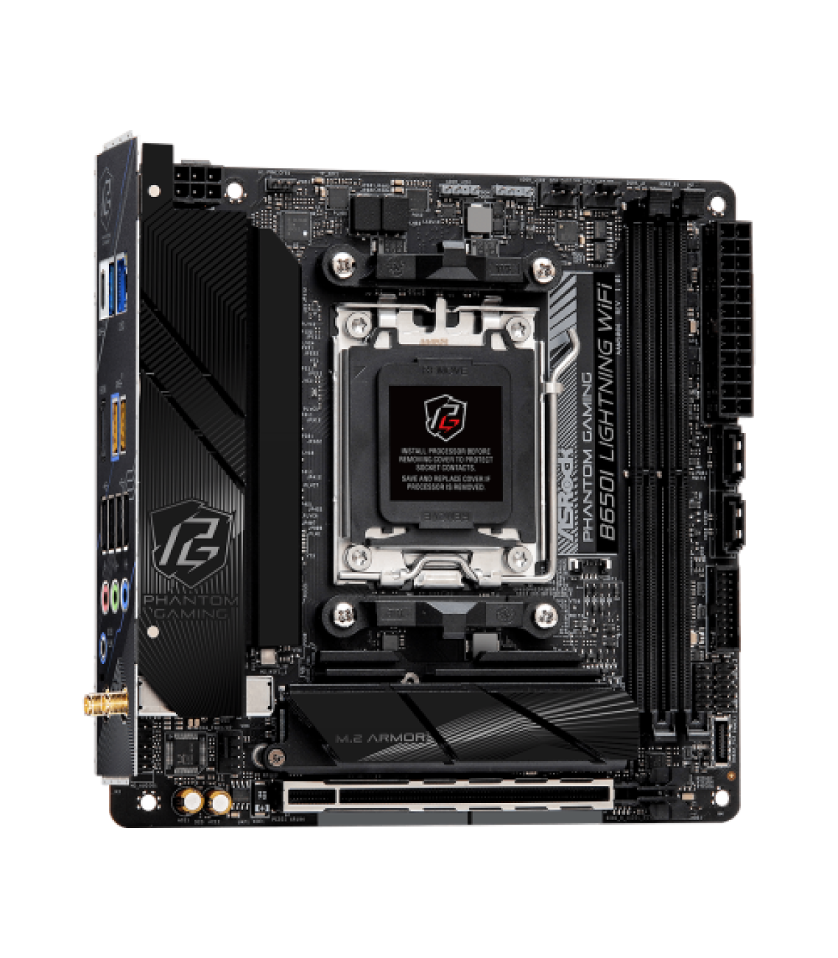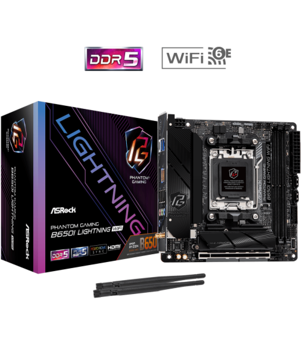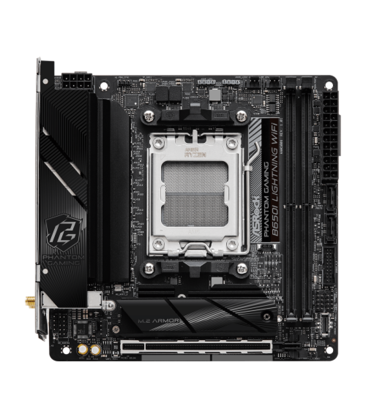 Asrock B650I Lightning WiFi. Fabricante de procesador: AMD, Socket de procesador: Zócalo AM5, Procesador compatible: AMD Ryzen 5 7th Gen, AMD Ryzen 7 7th Gen, AMD Ryzen 9 7th Gen. tipos de memoria compatibles: DDR5-SDRAM, Memoria interna máxima: 96 GB, Tipo de ranuras de memoria: DIMM. Interfaces de disco de almacenamiento soportados: M.2, SATA III, Tipos de unidades de almacenamiento admitidas: HDD & SSD, Niveles RAID: 0, 1, 10. Graphics chipset: AMD, Adaptador gráfico: AMD RDNA 2, Máxima resolución: 3840 x 2160 Pixeles. Tipo de interfaz ethernet: 2.5 Gigabit Ethernet, Controlador LAN: Dragon RTL8125BG, Estándar Wi-Fi: Wi-Fi 6E (802.11ax)