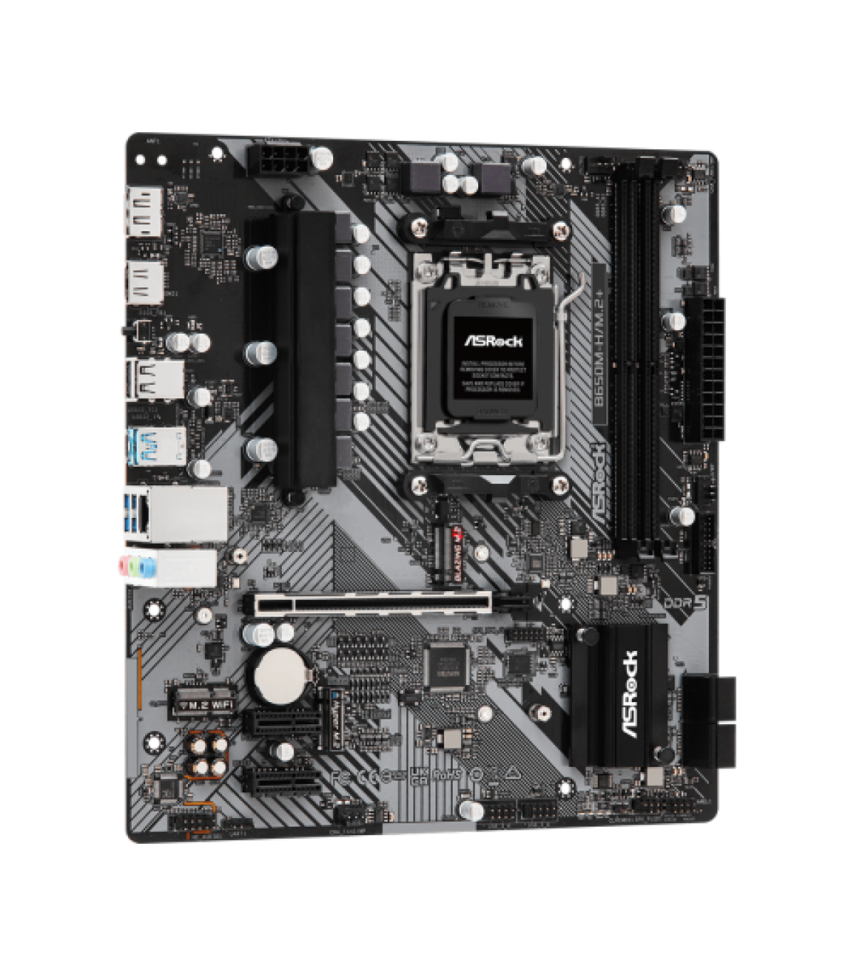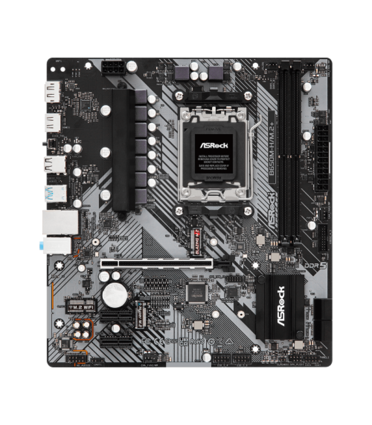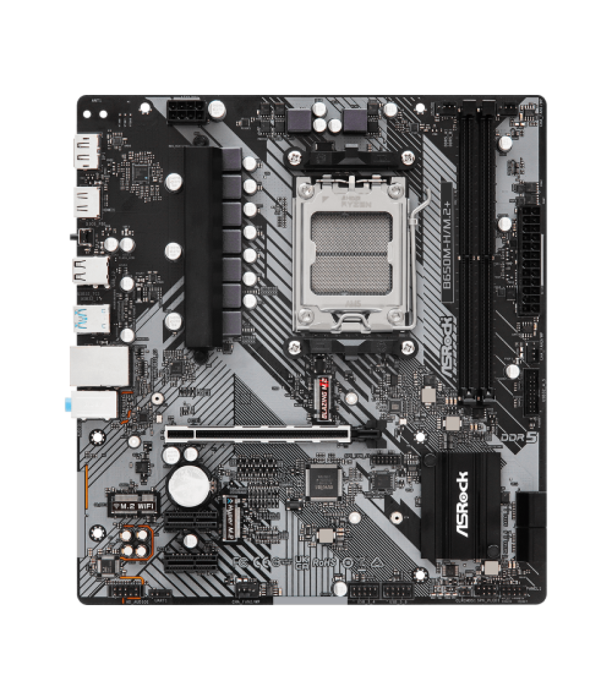 Asrock B650M-H/M.2+. Fabricante de procesador: AMD, Socket de procesador: Zócalo AM5. tipos de memoria compatibles: DDR5-SDRAM, Memoria interna máxima: 96 GB, Tipo de ranuras de memoria: DIMM. Interfaces de disco de almacenamiento soportados: M.2, SATA III, Niveles RAID: 0, 1, 10. Graphics chipset: AMD. Tipo de interfaz ethernet: Gigabit Ethernet, Controlador LAN: Realtek RTL8111H