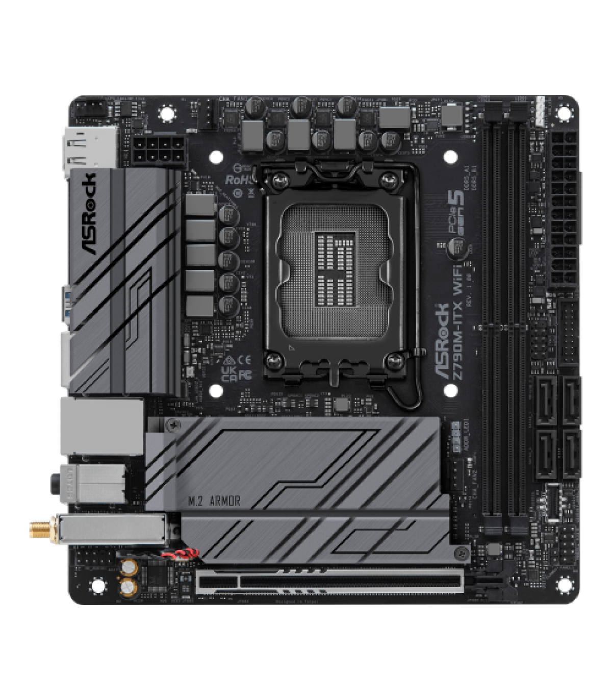 Asrock Z790M-ITX WiFi. Fabricante de procesador: Intel, Socket de procesador: LGA 1700, Procesador compatible: Intel® Core™ i5, Intel® Core™ i7, Intel® Core™ i9. tipos de memoria compatibles: DDR5-SDRAM, Memoria interna máxima: 64 GB, Tipo de ranuras de memoria: DIMM. Interfaces de disco de almacenamiento soportados: M.2, SATA III, Tipos de unidades de almacenamiento admitidas: HDD & SSD, Niveles RAID: 0, 1, 5, 10. Tipo de interfaz ethernet: 2.5 Gigabit Ethernet, Estándar Wi-Fi: Wi-Fi 6E (802.11ax), Wi-Fi estándares: 802.11a, 802.11b, 802.11g, Wi-Fi 4 (802.11n), Wi-Fi 5 (802.11ac), Wi-Fi 6E (802.11ax). Componente para: PC, Factor de forma: mini ITX, Familia del chipset: Intel