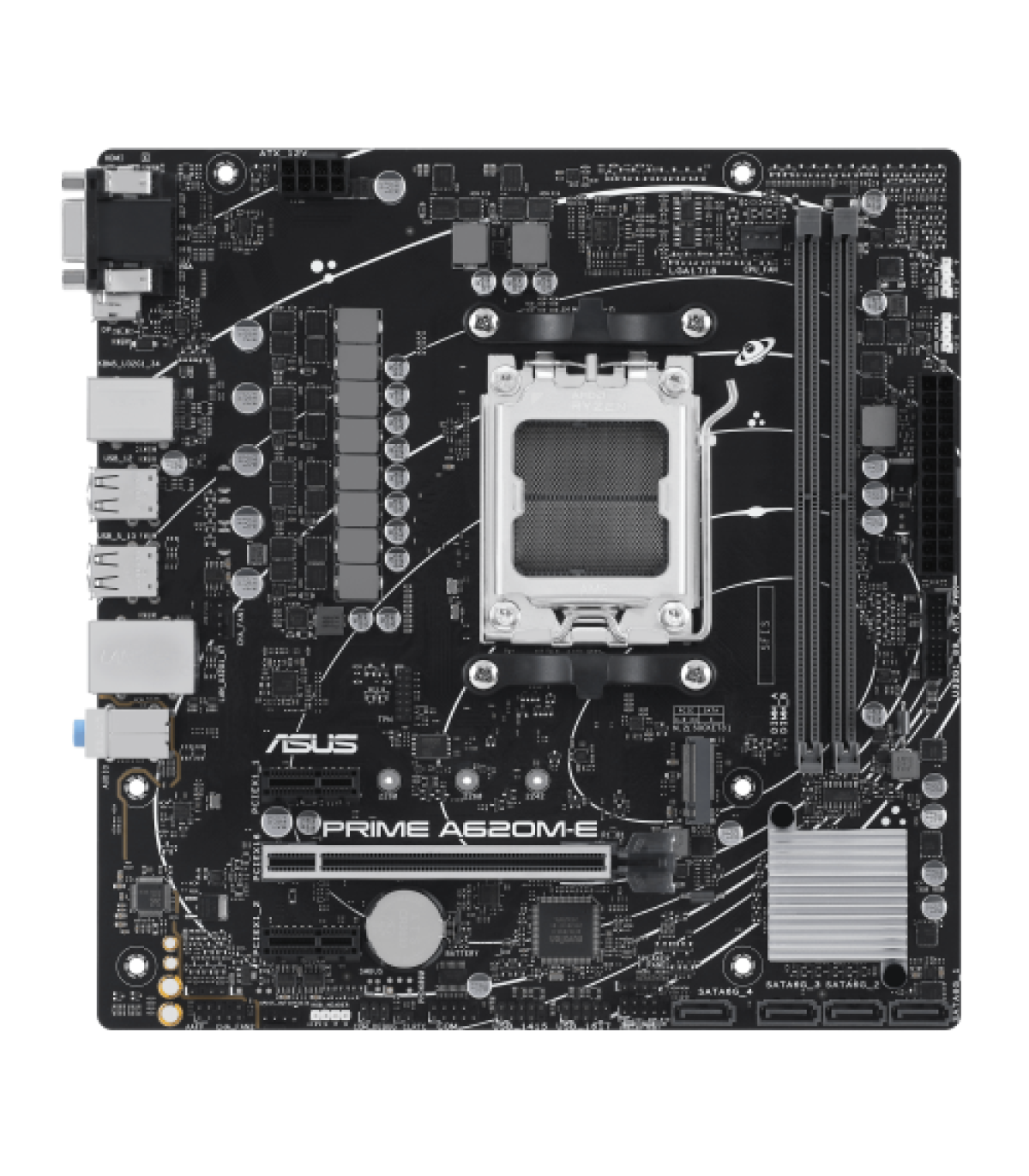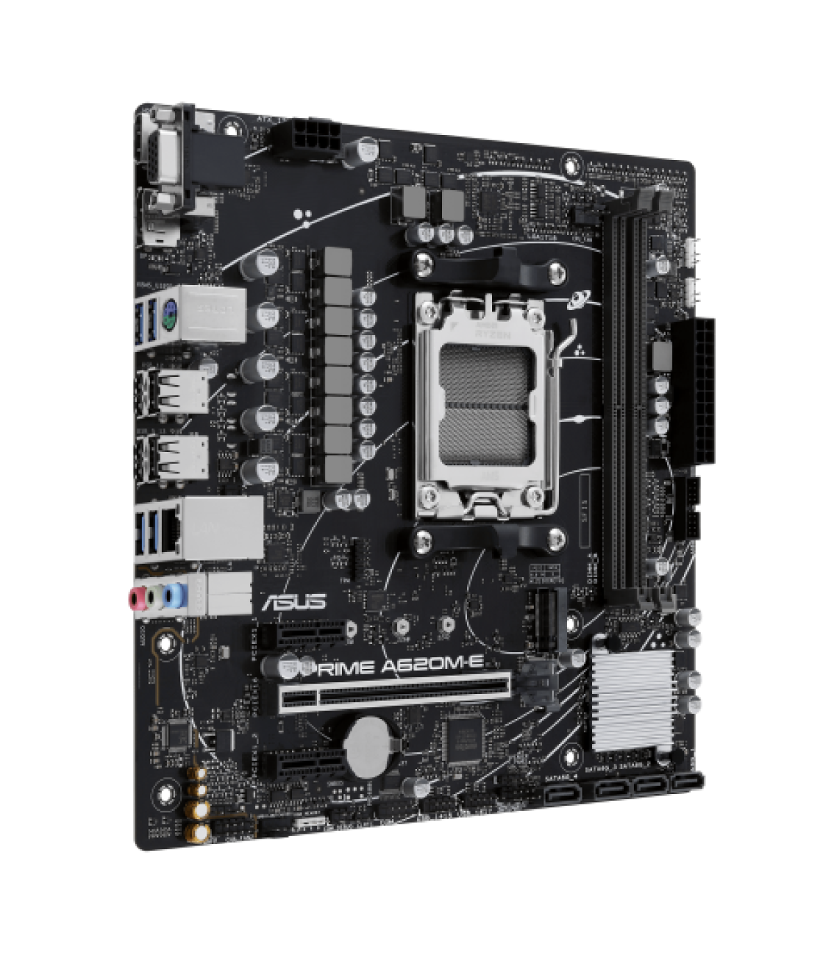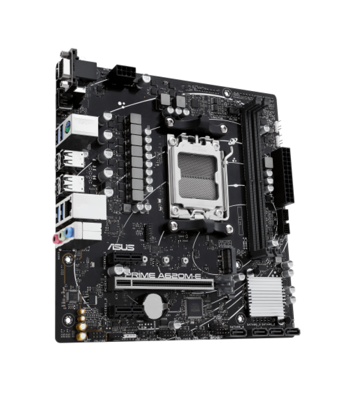 ASUS PRIME A620M-E-CSM. Fabricante de procesador: AMD, Socket de procesador: Zócalo AM5, Procesador compatible: AMD Ryzen 7000 Series. tipos de memoria compatibles: DDR5-SDRAM, Memoria interna máxima: 96 GB, Tipo de ranuras de memoria: DIMM. Interfaces de disco de almacenamiento soportados: M.2, SATA III, Tipos de unidades de almacenamiento admitidas: HDD & SSD, Niveles RAID: 0, 1, 10. Tipo de interfaz ethernet: Gigabit Ethernet. Componente para: PC, Factor de forma: micro ATX, Familia del chipset: AMD