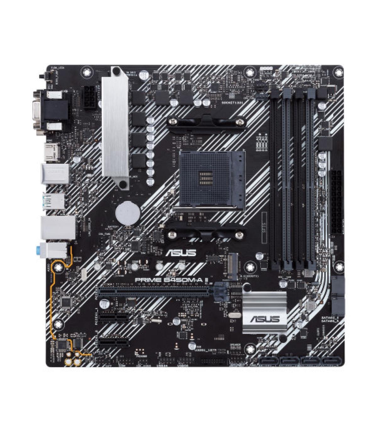ASUS PRIME B450M-A II. Fabricante de procesador: AMD, Socket de procesador: Zócalo AM4, Procesador compatible: AMD Ryzen 3, AMD Ryzen 5, AMD Ryzen 7, 3rd Generation AMD Ryzen 9. tipos de memoria compatibles: DDR4-SDRAM, Tipo de ranuras de memoria: DIMM, Velocidades de reloj de memoria soportadas: 2133,2400,2666,2800,3000,3200,3300,3400,3466,3600,3733,3866,4000,4400 MHz. Interfaces de disco de almacenamiento soportados: Serial ATA III, Tipos de unidades de almacenamiento admitidas: HDD & SSD. Versión HDMI: 2.0b. Tipo de interfaz ethernet: Gigabit Ethernet, Controlador LAN: Realtek RTL8111H