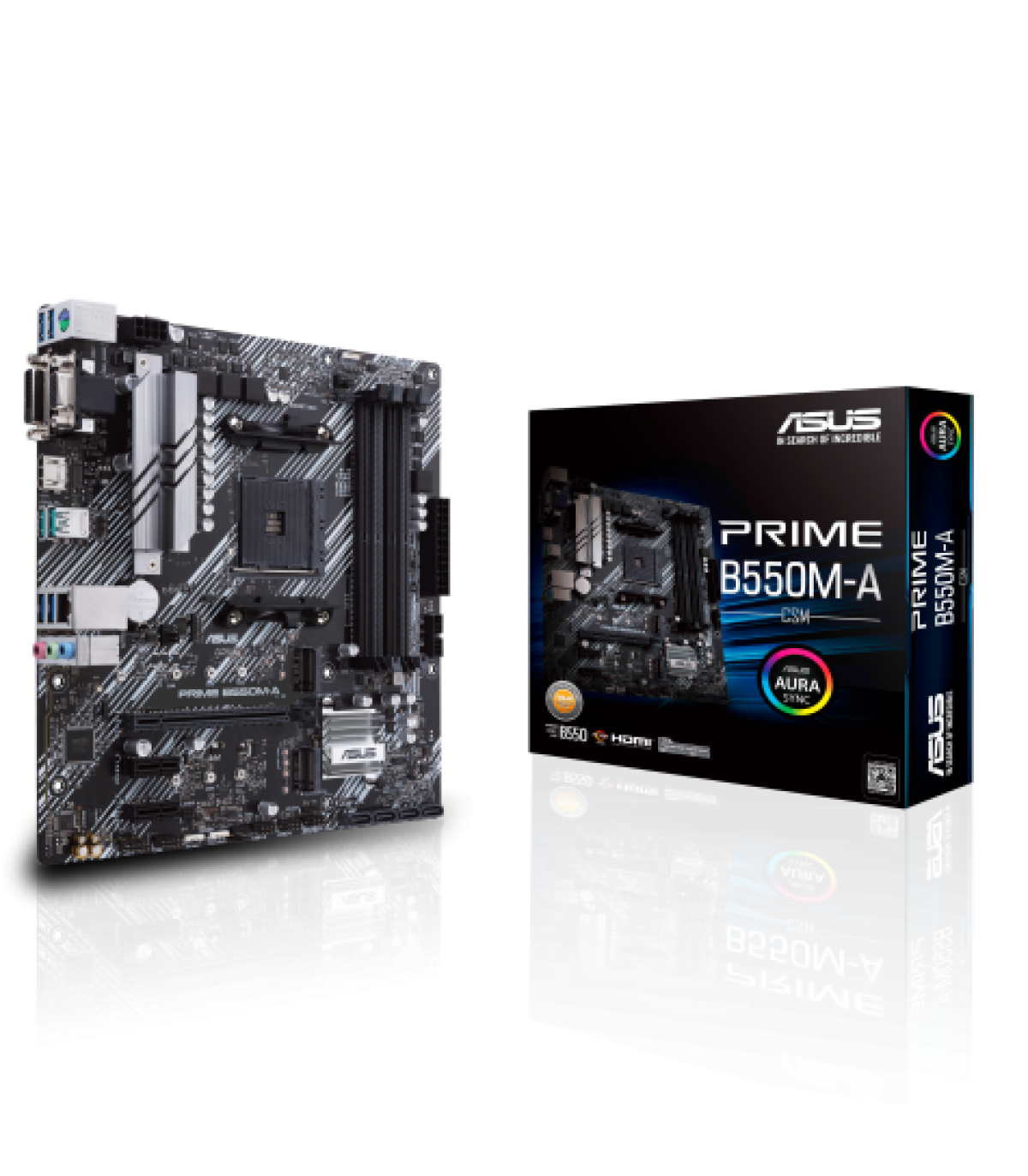 ASUS Prime B550M-A/CSM. Fabricante de procesador: AMD, Socket de procesador: Zócalo AM4, Procesador compatible: 3rd Generation AMD Ryzen™ 3, 3rd Generation AMD Ryzen 5. tipos de memoria compatibles: DDR4-SDRAM, Memoria interna máxima: 128 GB, Tipo de ranuras de memoria: DIMM. Interfaces de disco de almacenamiento soportados: M.2, SATA III. Tipo de interfaz ethernet: Gigabit Ethernet, Controlador LAN: Realtek RTL8111H. Componente para: PC, Factor de forma: micro ATX, Familia del chipset: AMD