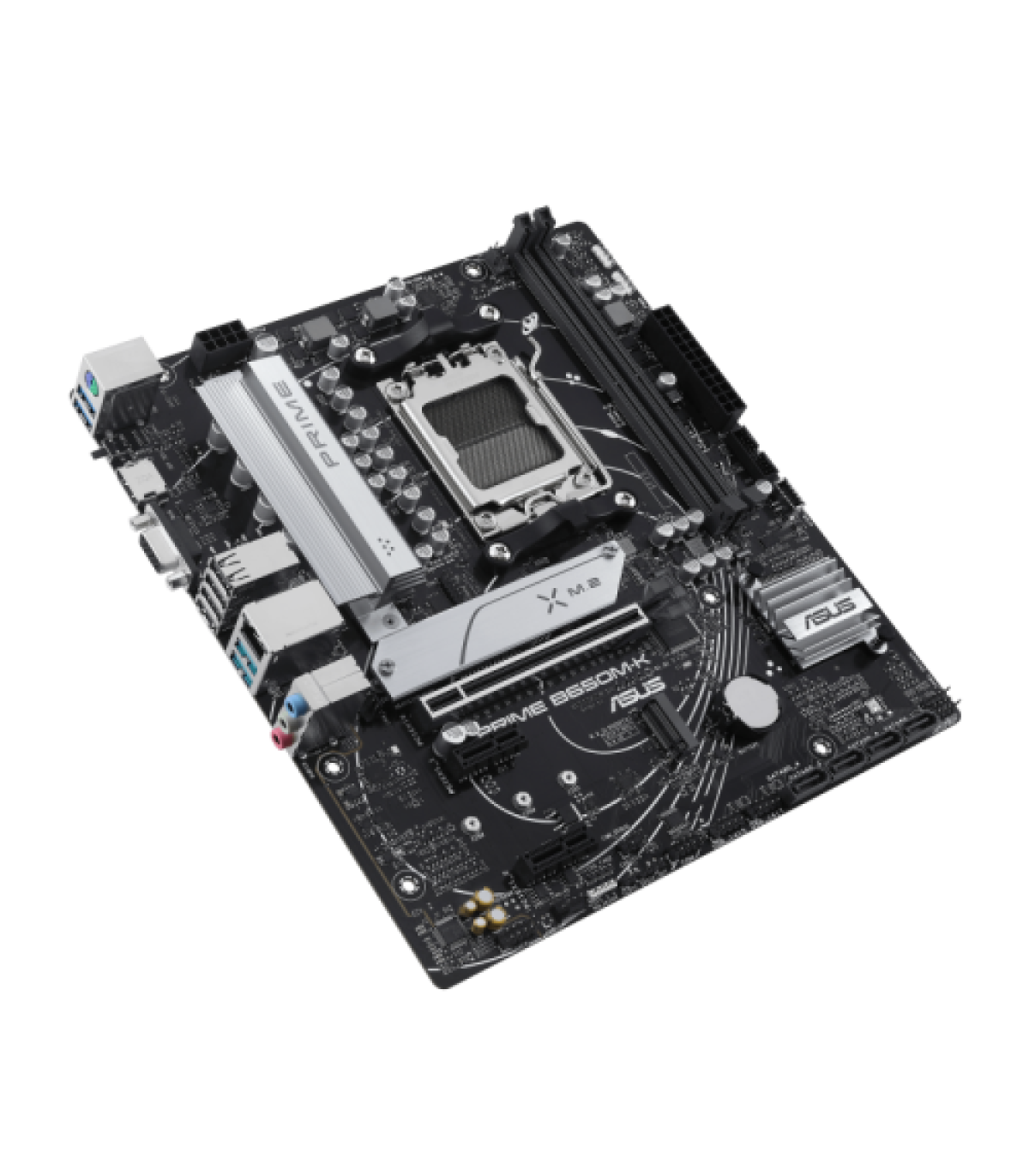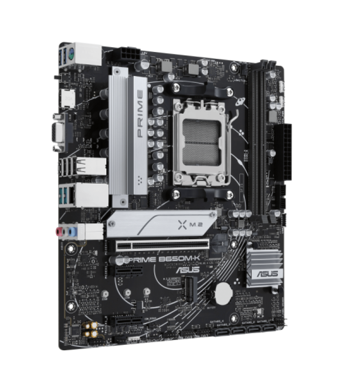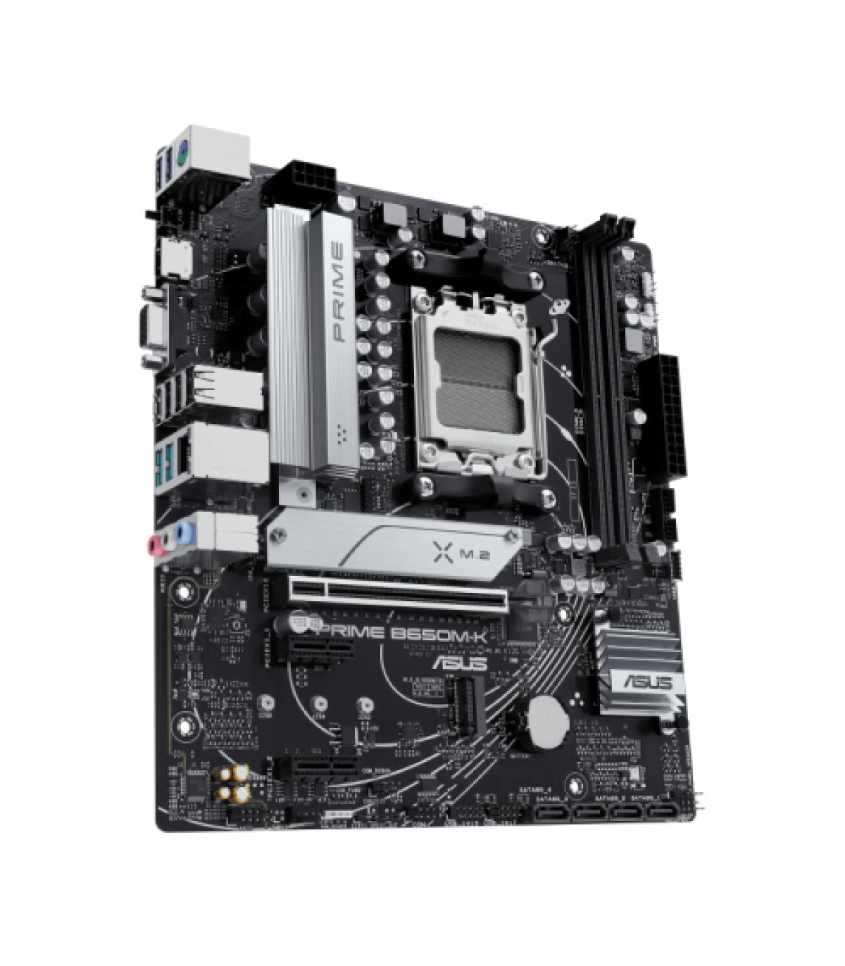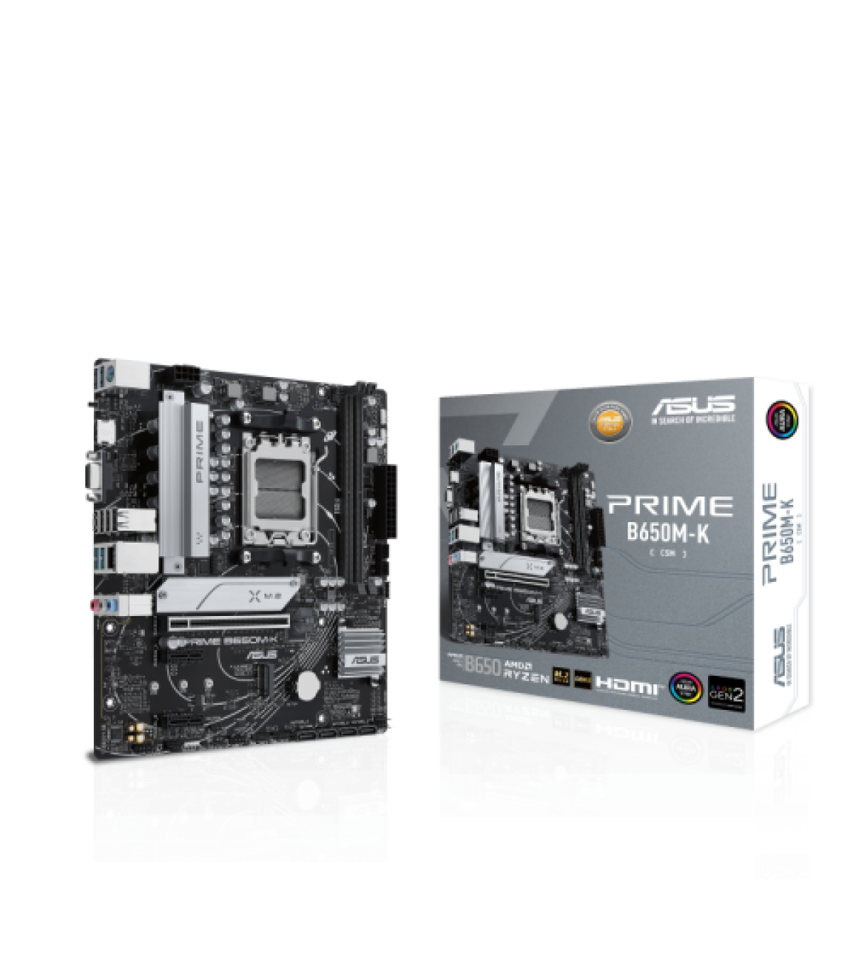 ASUS PRIME B650M-K. Fabricante de procesador: AMD, Socket de procesador: Zócalo AM5, Procesador compatible: AMD Ryzen™ 5, AMD Ryzen™ 7, AMD Ryzen 9 7th Gen. tipos de memoria compatibles: DDR5-SDRAM, Memoria interna máxima: 96 GB, Tipo de ranuras de memoria: DIMM. Interfaces de disco de almacenamiento soportados: M.2, SATA III, Tipos de unidades de almacenamiento admitidas: HDD & SSD, Niveles RAID: 0, 1, 10. Tipo de interfaz ethernet: 2.5 Gigabit Ethernet. Componente para: PC, Factor de forma: micro ATX, Familia del chipset: AMD