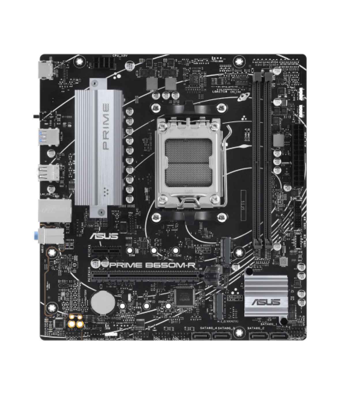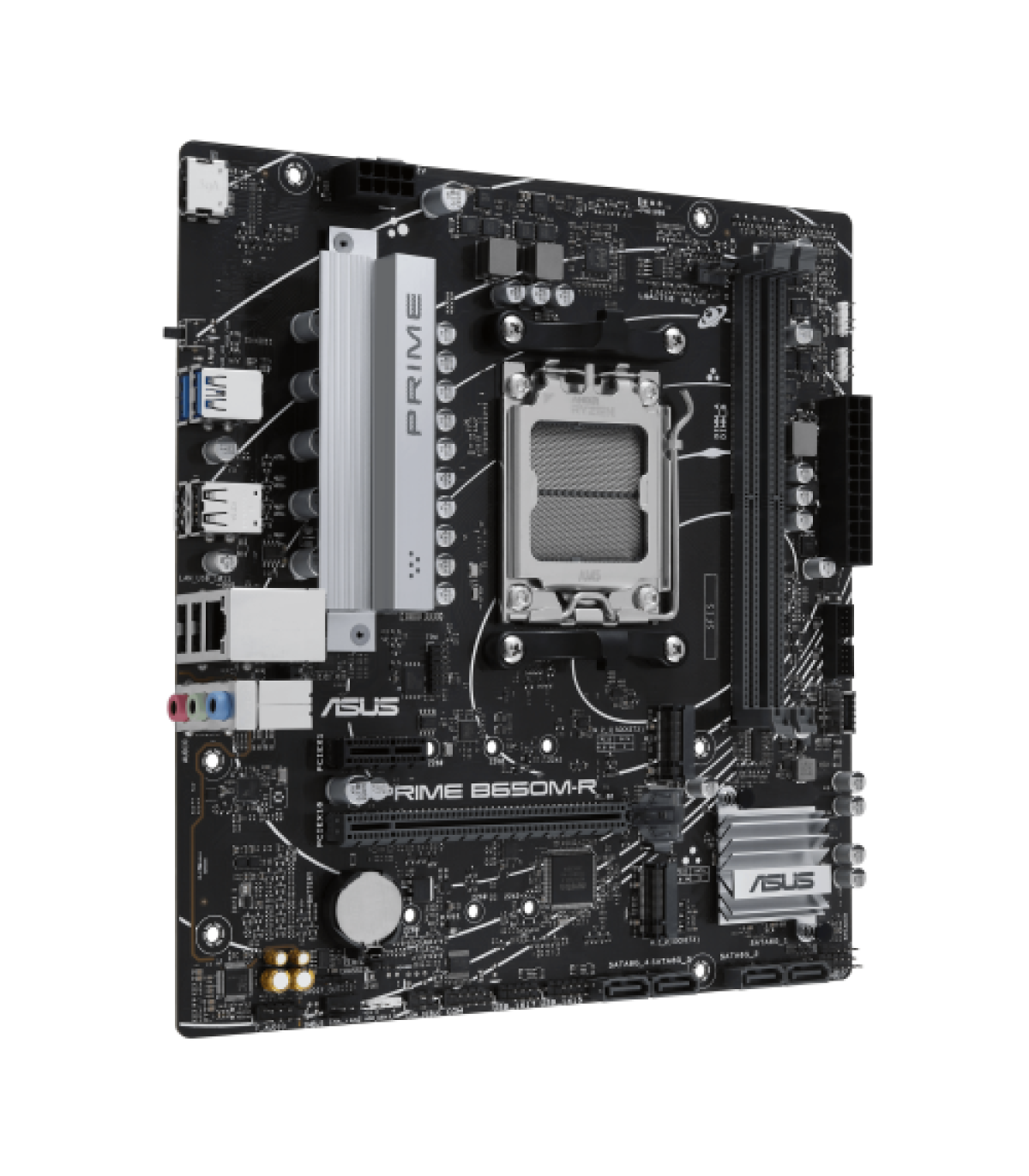 ASUS PRIME B650M-R. Fabricante de procesador: AMD, Socket de procesador: Zócalo AM5, Procesador compatible: AMD Ryzen 9 8th Gen, AMD Ryzen™ 3, AMD Ryzen™ 5, AMD Ryzen™ 7, AMD Ryzen 9 7th Gen. tipos de memoria compatibles: DDR5-SDRAM, Memoria interna máxima: 96 GB, Tipo de ranuras de memoria: DIMM. Interfaces de disco de almacenamiento soportados: M.2, SATA III, Tipos de unidades de almacenamiento admitidas: HDD & SSD, Niveles RAID: 0, 1, 10. Tipo de interfaz ethernet: 2.5 Gigabit Ethernet. Componente para: PC, Factor de forma: micro ATX, Familia del chipset: AMD