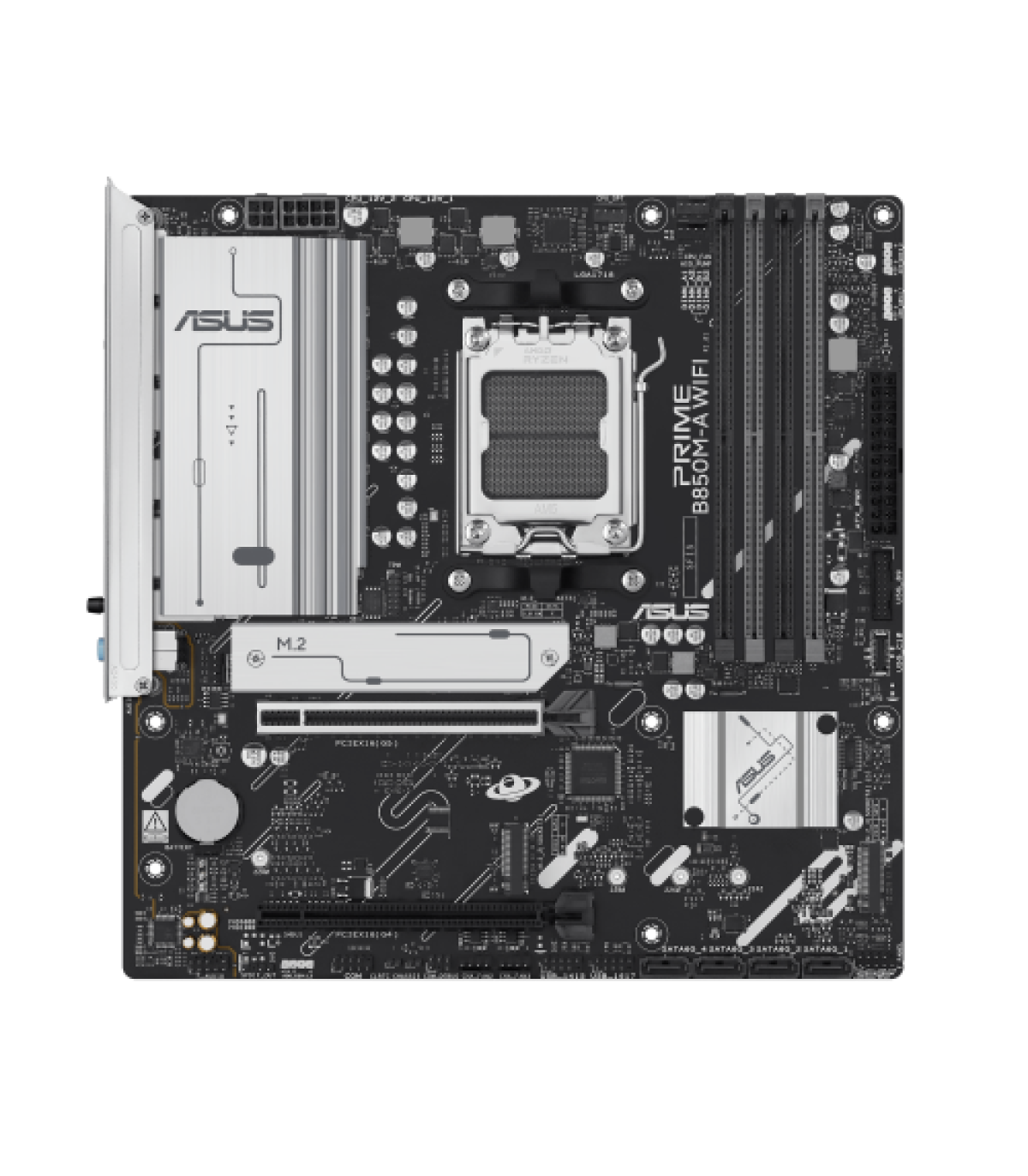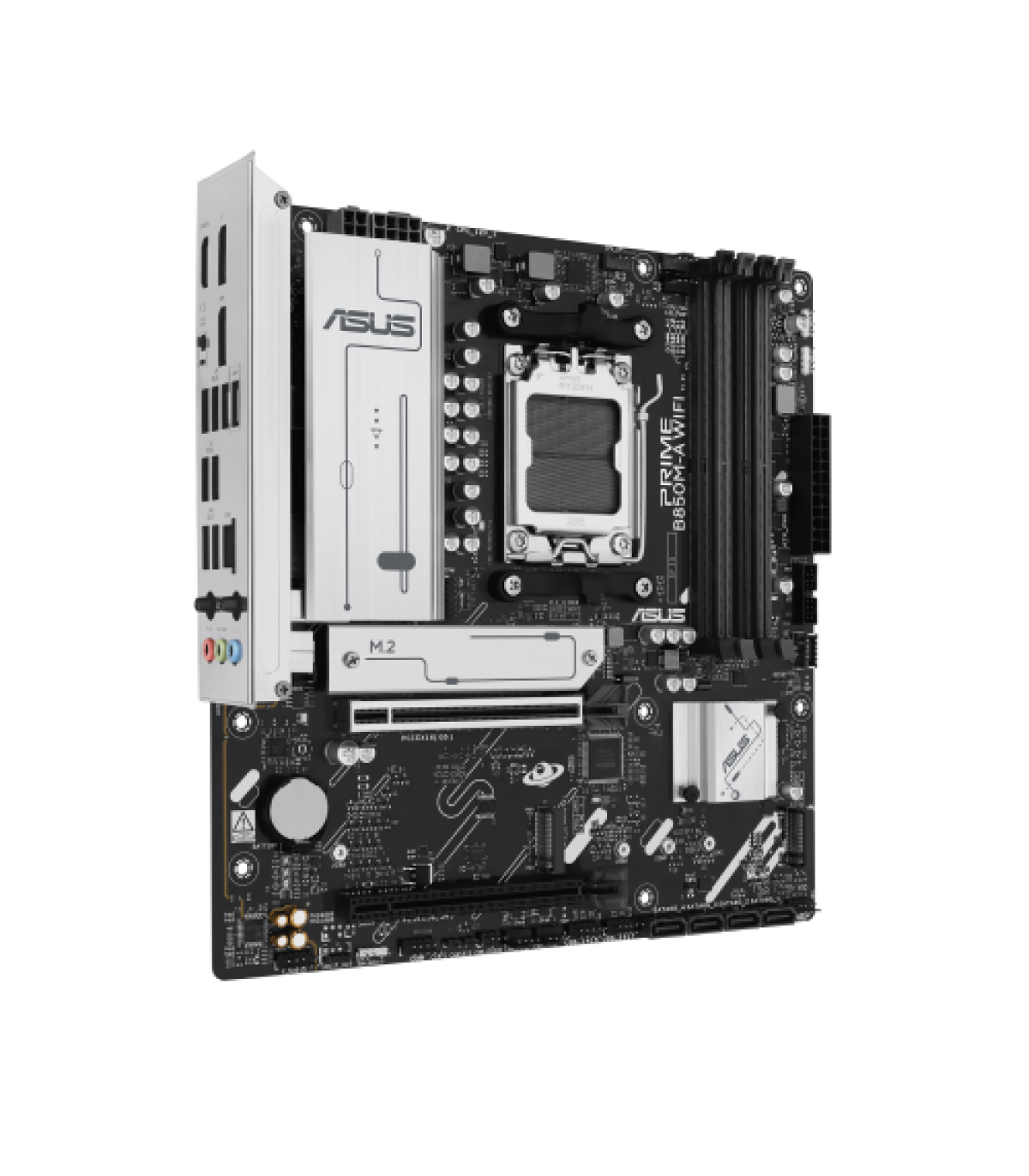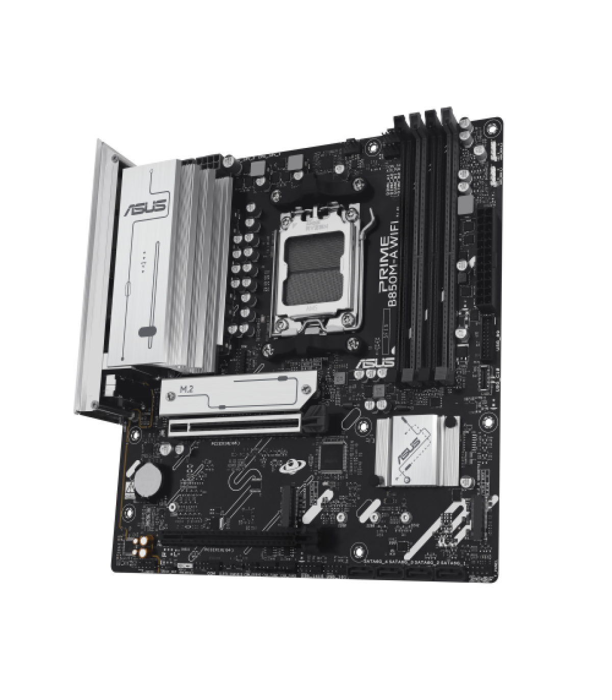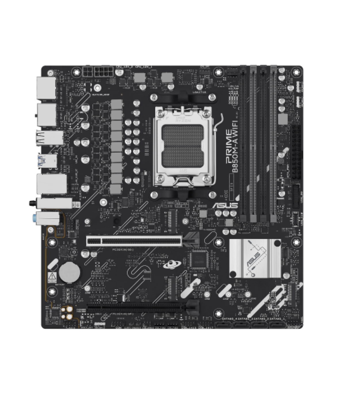ASUS PRIME B850M-A WIFI. Fabricante de procesador: AMD, Socket de procesador: Zócalo AM5, Procesador compatible: AMD Ryzen 7000 Series, AMD Ryzen 8000 Series, AMD Ryzen 9000 Series. tipos de memoria compatibles: DDR5-SDRAM, Memoria interna máxima: 256 GB, Tipo de ranuras de memoria: DIMM. Interfaces de disco de almacenamiento soportados: M.2, SATA III, Tipos de unidades de almacenamiento admitidas: HDD & SSD, Niveles RAID: 0, 1, 5, 10. Tipo de interfaz ethernet: 2.5 Gigabit Ethernet, Ethernet rápido, Gigabit Ethernet, Estándar Wi-Fi: Wi-Fi 6E (802.11ax). Componente para: PC, Factor de forma: micro ATX, Familia del chipset: AMD