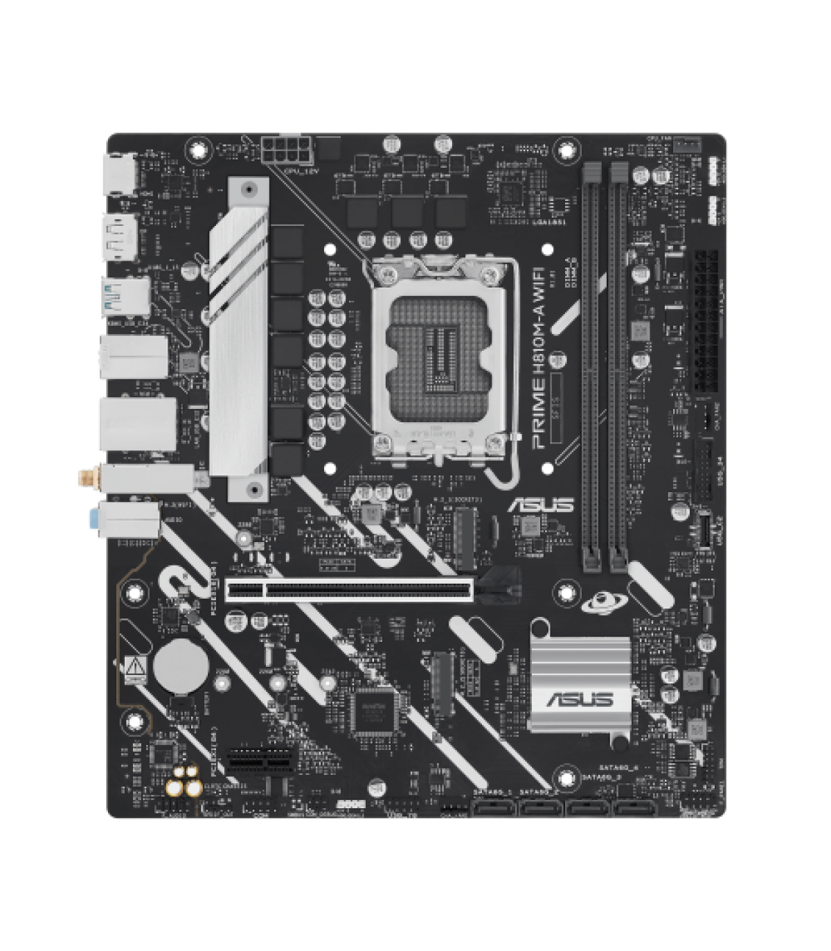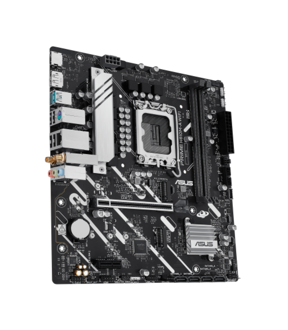 ASUS PRIME H810M-A WIFI. Fabricante de procesador: Intel, Socket de procesador: LGA 1851 (Socket V1), Procesador compatible: Intel Core Ultra (Series 2). tipos de memoria compatibles: DDR5-SDRAM, Memoria interna máxima: 128 GB, Tipo de ranuras de memoria: DIMM. Interfaces de disco de almacenamiento soportados: M.2, SATA III, Tipos de unidades de almacenamiento admitidas: HDD & SSD, Niveles RAID: 0, 1, 5, 10. Tipo de interfaz ethernet: Gigabit Ethernet, Estándar Wi-Fi: Wi-Fi 6 (802.11ax), Wi-Fi estándares: Wi-Fi 6 (802.11ax). Componente para: PC, Factor de forma: micro ATX, Familia del chipset: Intel