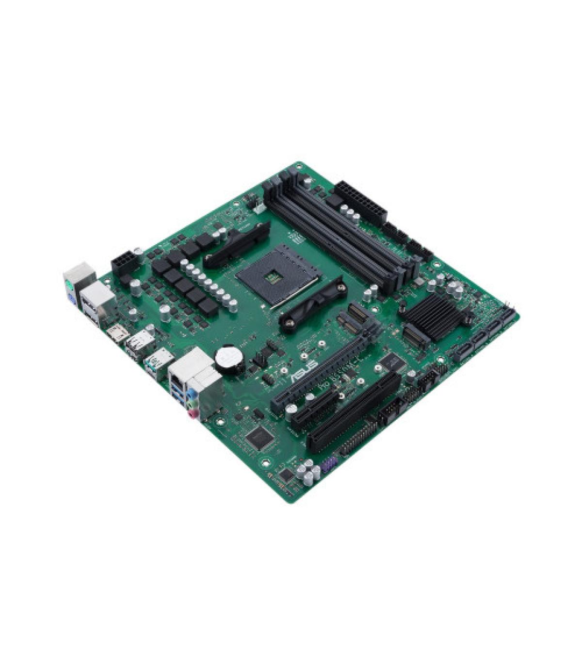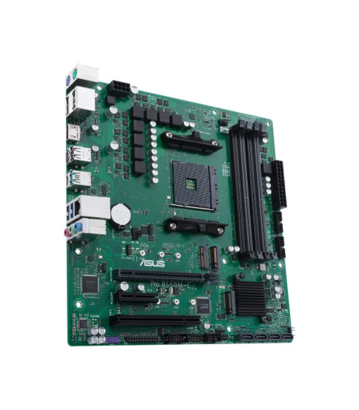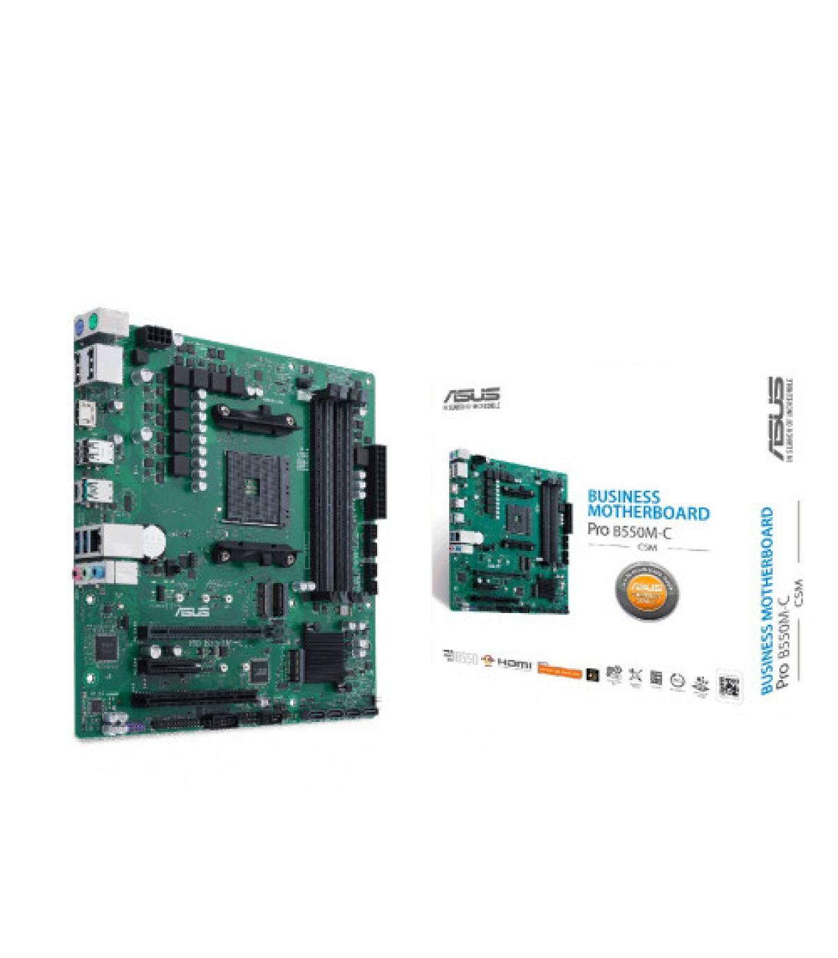 ASUS PRO B550M-C/CSM. Fabricante de procesador: AMD, Socket de procesador: Zócalo AM4, Procesador compatible: AMD Athlon, AMD Ryzen 3000 Series. tipos de memoria compatibles: DDR4-SDRAM, Memoria interna máxima: 128 GB, Tipo de ranuras de memoria: DIMM. Interfaces de disco de almacenamiento soportados: SATA III, Tipos de unidades de almacenamiento admitidas: HDD & SSD, Niveles RAID: 0, 1, 10. Tipo de interfaz ethernet: Gigabit Ethernet, Controlador LAN: Realtek RTL8111H. Componente para: PC, Factor de forma: micro ATX, Familia del chipset: AMD