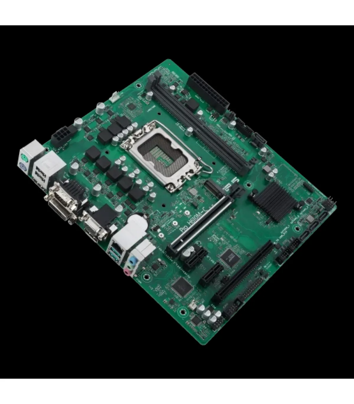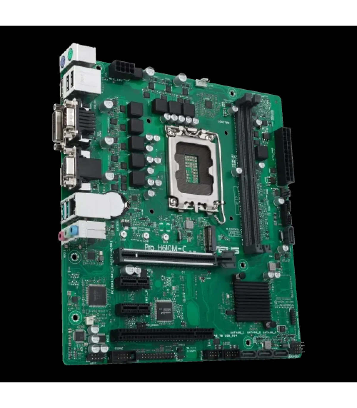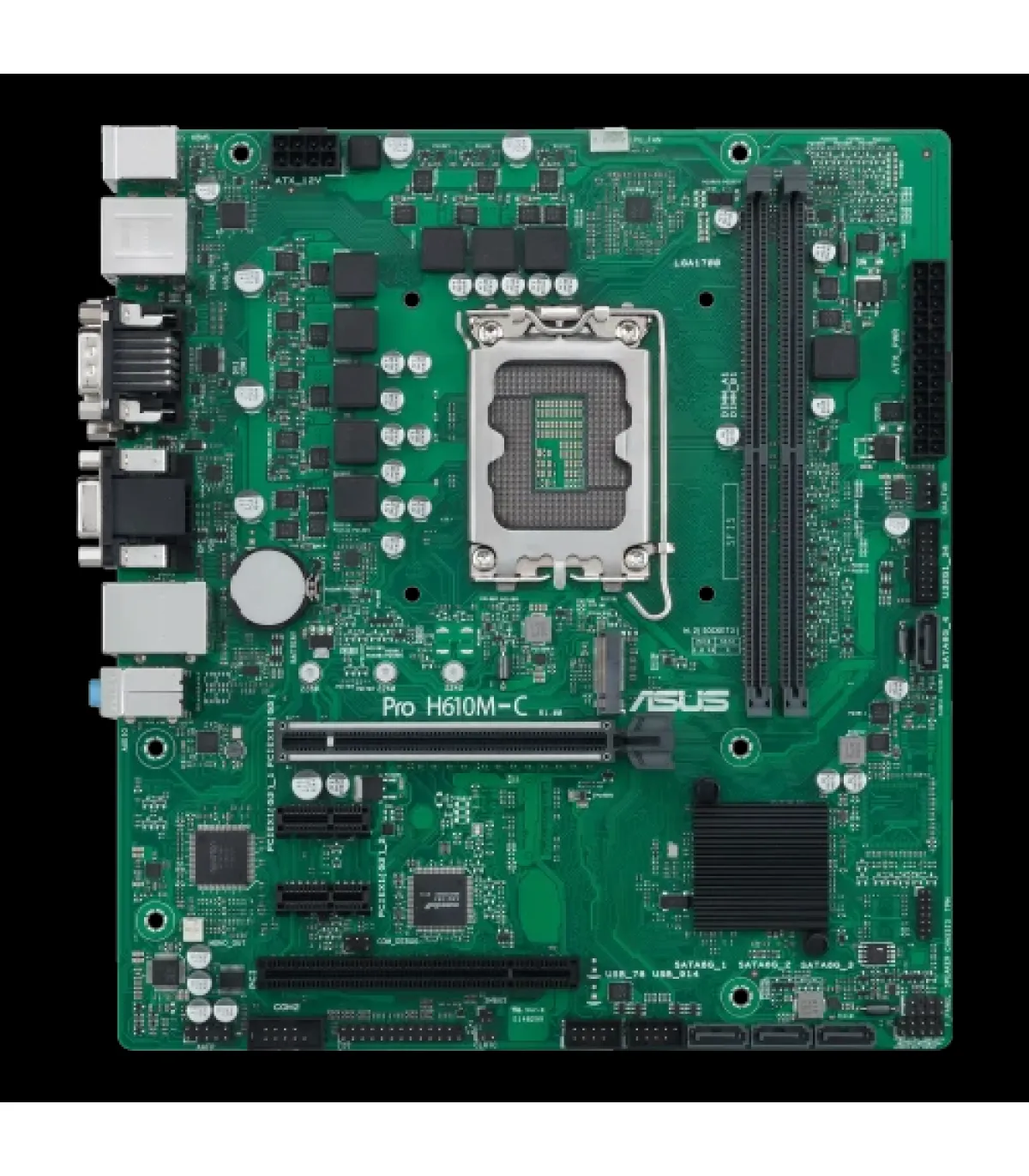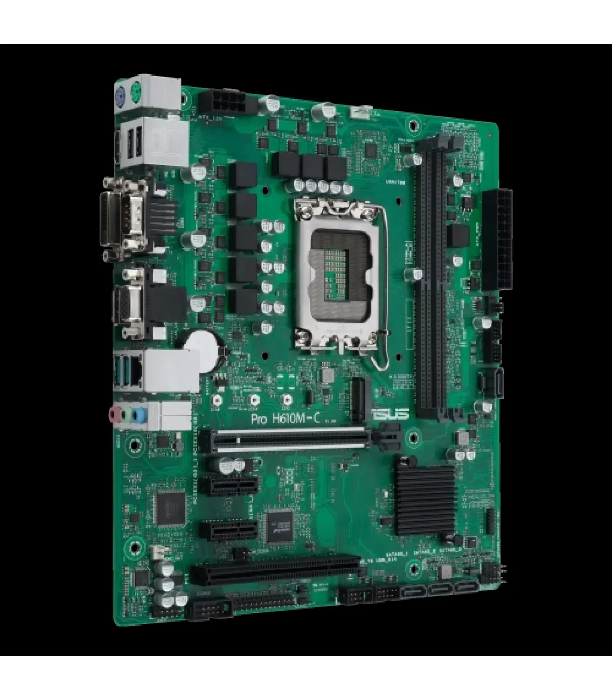 ASUS Pro H610M-C-CSM. Fabricante de procesador: Intel, Socket de procesador: LGA 1700, Procesador compatible: Intel® Celeron®, Intel® Core™ i3, Intel® Core™ i5, Intel® Core™ i7, Intel® Core™ i9, Intel® Pentium®. tipos de memoria compatibles: DDR5-SDRAM, Memoria interna máxima: 64 GB, Tipo de ranuras de memoria: DIMM. Interfaces de disco de almacenamiento soportados: M.2, SATA III, Tipos de unidades de almacenamiento admitidas: HDD & SSD. Tipo de interfaz ethernet: Gigabit Ethernet. Componente para: PC, Factor de forma: micro ATX, Familia del chipset: Intel