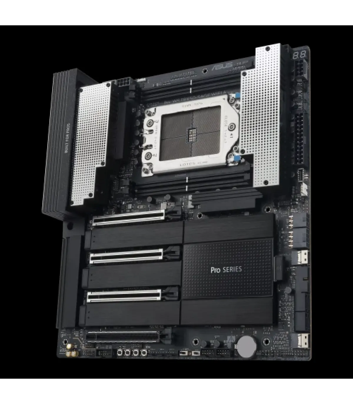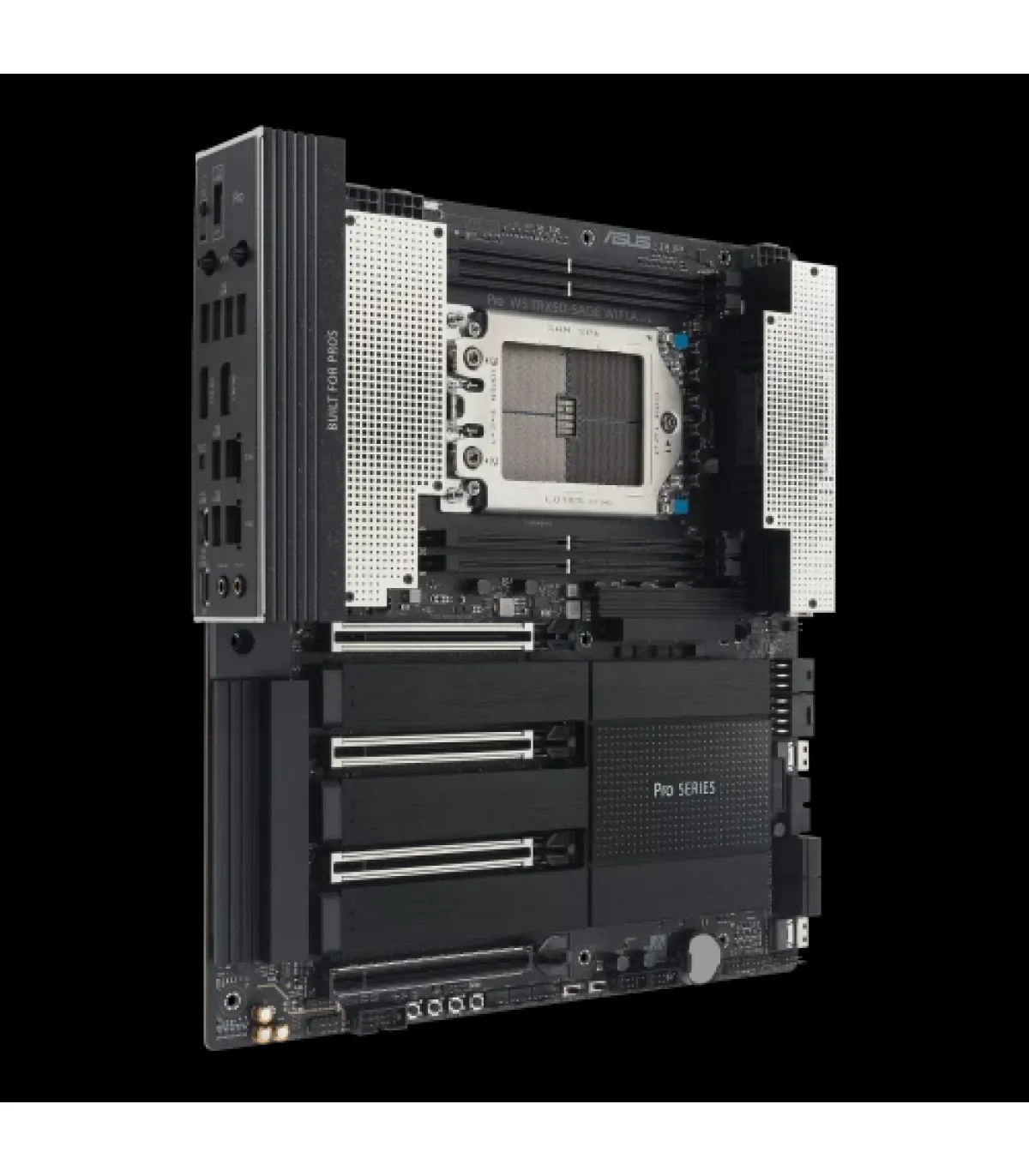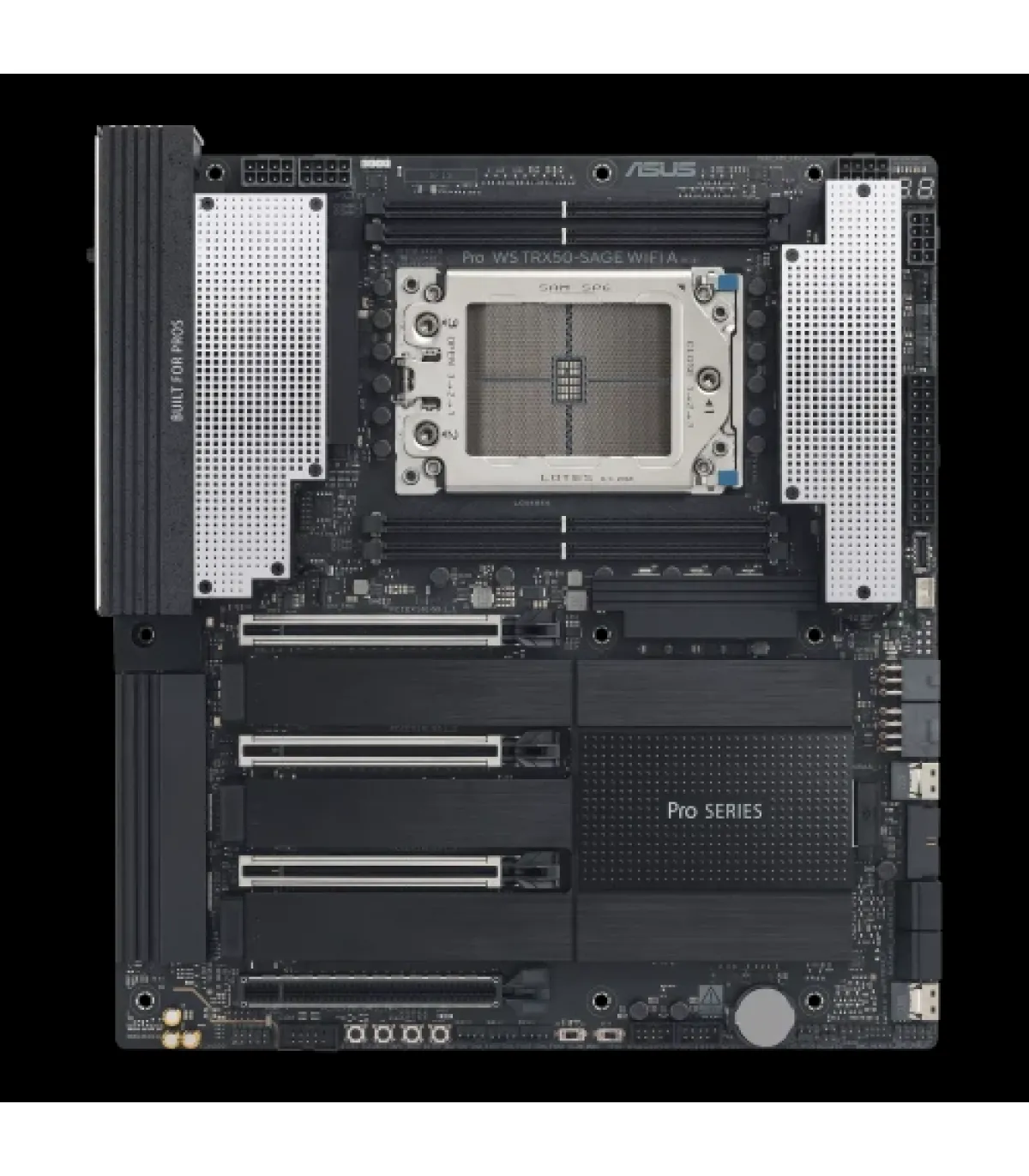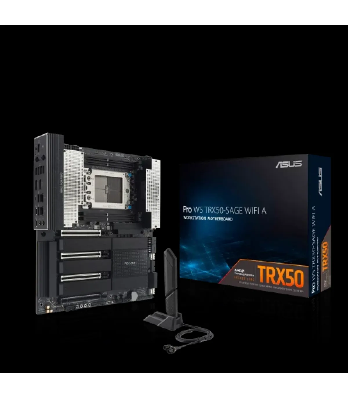 ASUS PRO WS TRX50-SAGE WIFI A. Fabricante de procesador: AMD, Socket de procesador: Socket sTR5, Procesador compatible: AMD Ryzen Threadripper 7000 Series, AMD Ryzen Threadripper PRO 7000 WX-Series. tipos de memoria compatibles: DDR5-SDRAM, Tipo de ranuras de memoria: DIMM, Canales de memoria: Doble canal. Interfaces de disco de almacenamiento soportados: M.2, SATA III, SlimSAS, Tipos de unidades de almacenamiento admitidas: HDD & SSD, Niveles RAID: 0, 1, 5, 10. Tipo de interfaz ethernet: 2.5 Gigabit Ethernet, 10 Gigabit Ethernet, Controlador LAN: Intel I226-LM, Estándar Wi-Fi: Wi-Fi 7 (802.11be). Componente para: Puesto de trabajo, Factor de forma: CEB, Familia del chipset: AMD