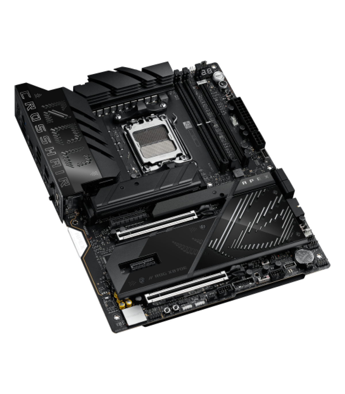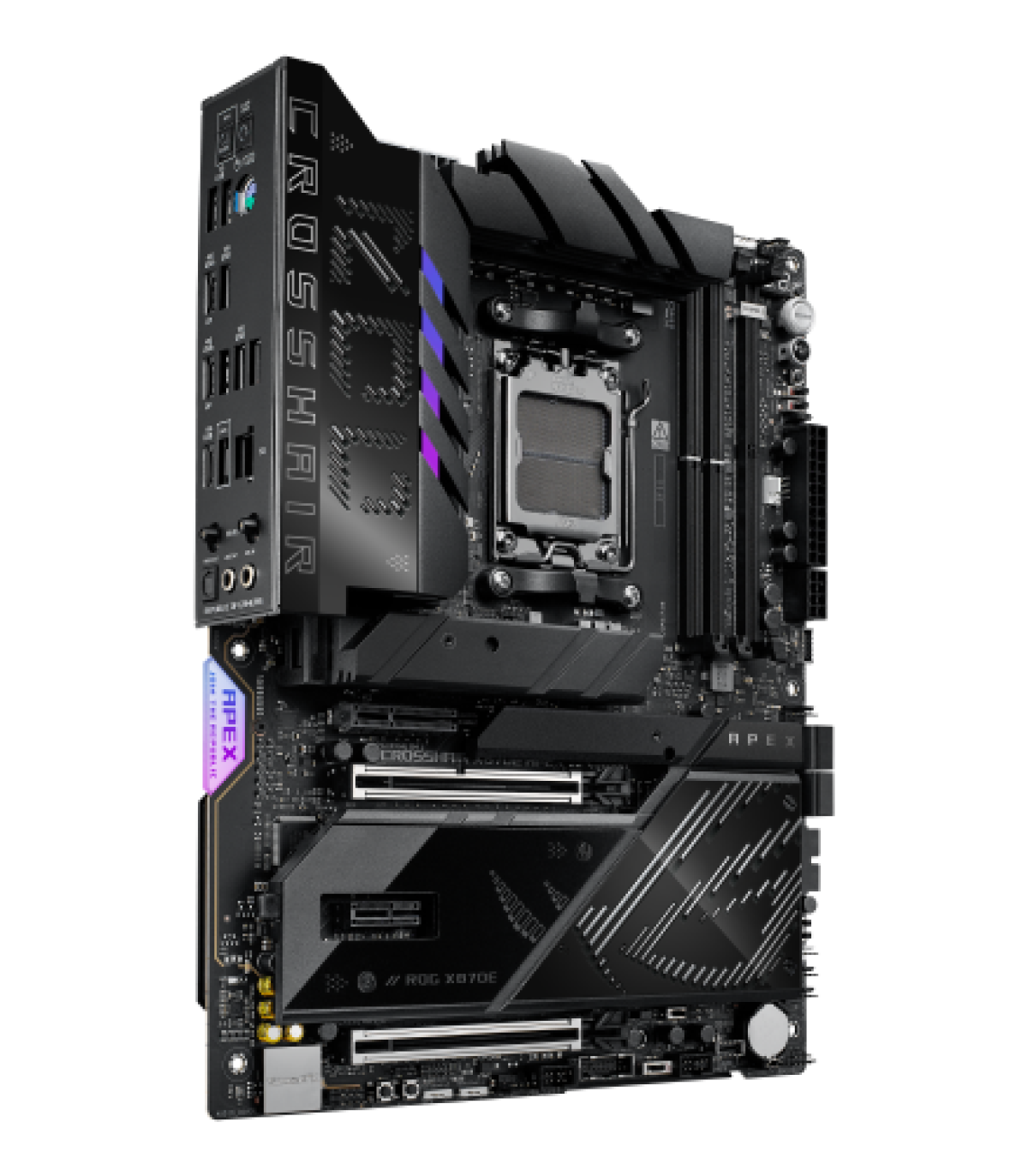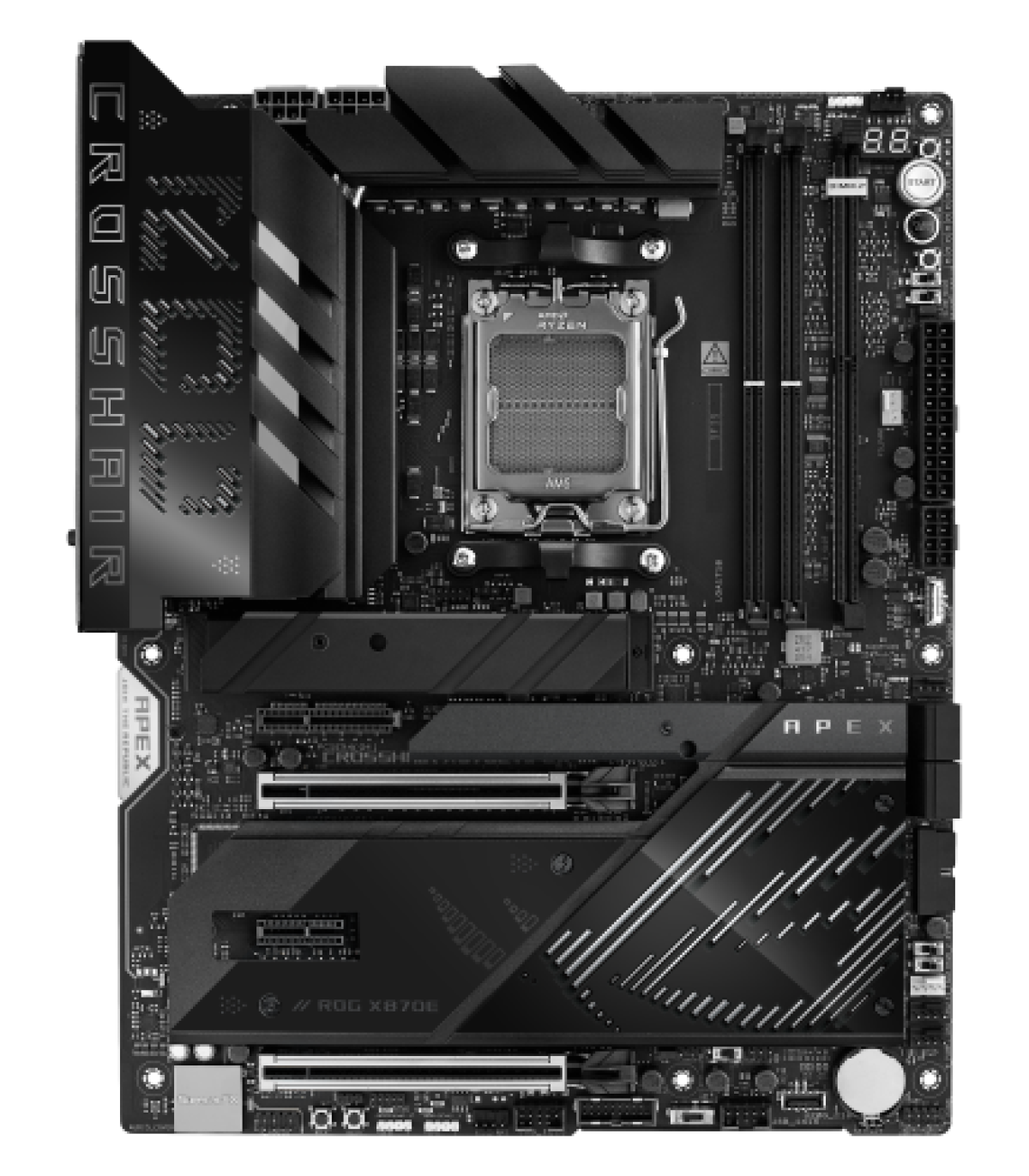 ASUS ROG CROSSHAIR X870E APEX. Fabricante de procesador: AMD, Socket de procesador: Zócalo AM5, Procesador compatible: AMD Ryzen 7000 Series, AMD Ryzen 8000 Series, AMD Ryzen 9000 Series. tipos de memoria compatibles: DDR5-SDRAM, Memoria interna máxima: 128 GB, Tipo de ranuras de memoria: DIMM. Interfaces de disco de almacenamiento soportados: M.2, SATA III, Tipos de unidades de almacenamiento admitidas: HDD & SSD, Niveles RAID: 0, 1, 5, 10. Tipo de interfaz ethernet: 5 Gigabit Ethernet, Estándar Wi-Fi: Wi-Fi 7 (802.11be), Wi-Fi estándares: Wi-Fi 7 (802.11be). Componente para: PC, Factor de forma: ATX, Familia del chipset: AMD