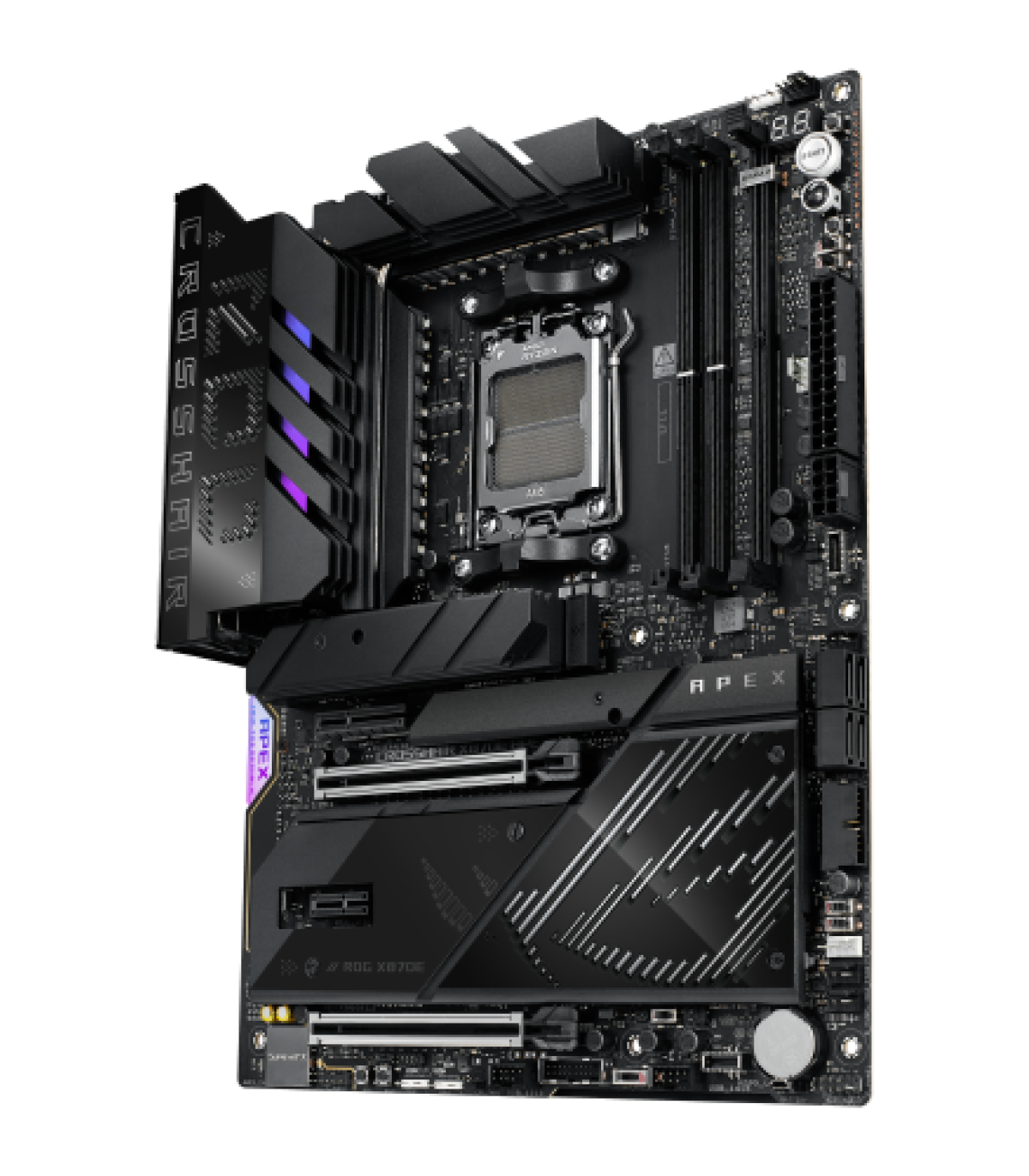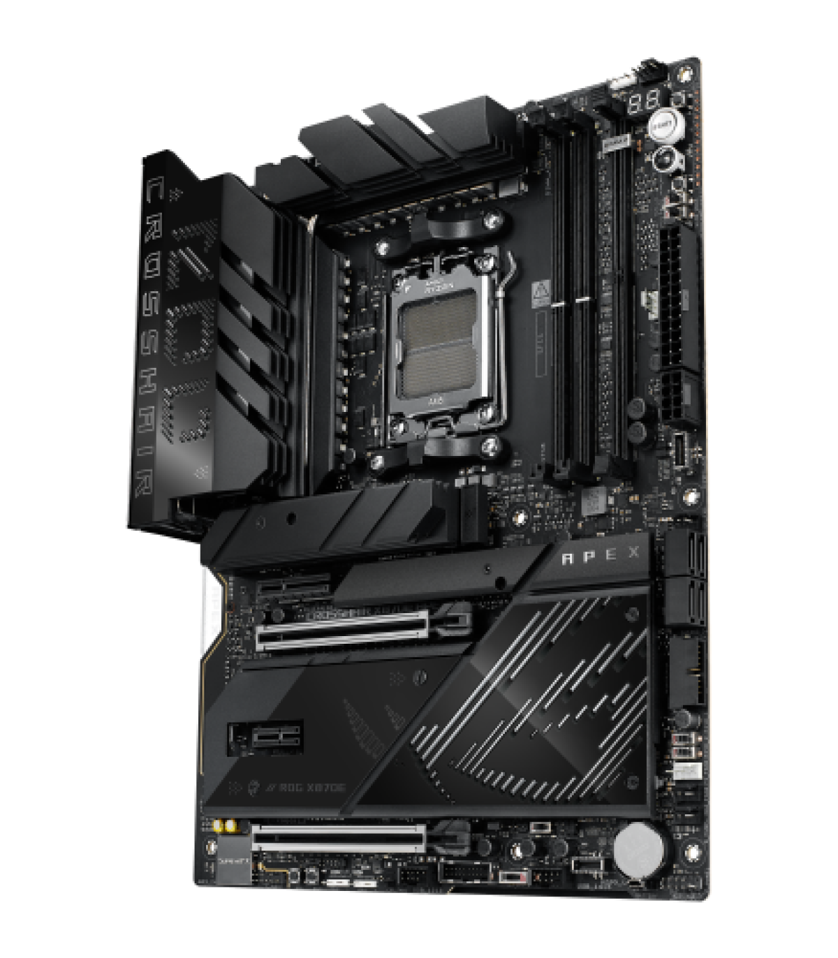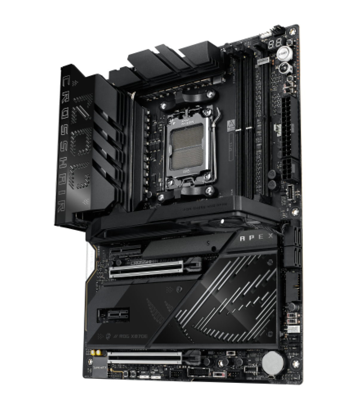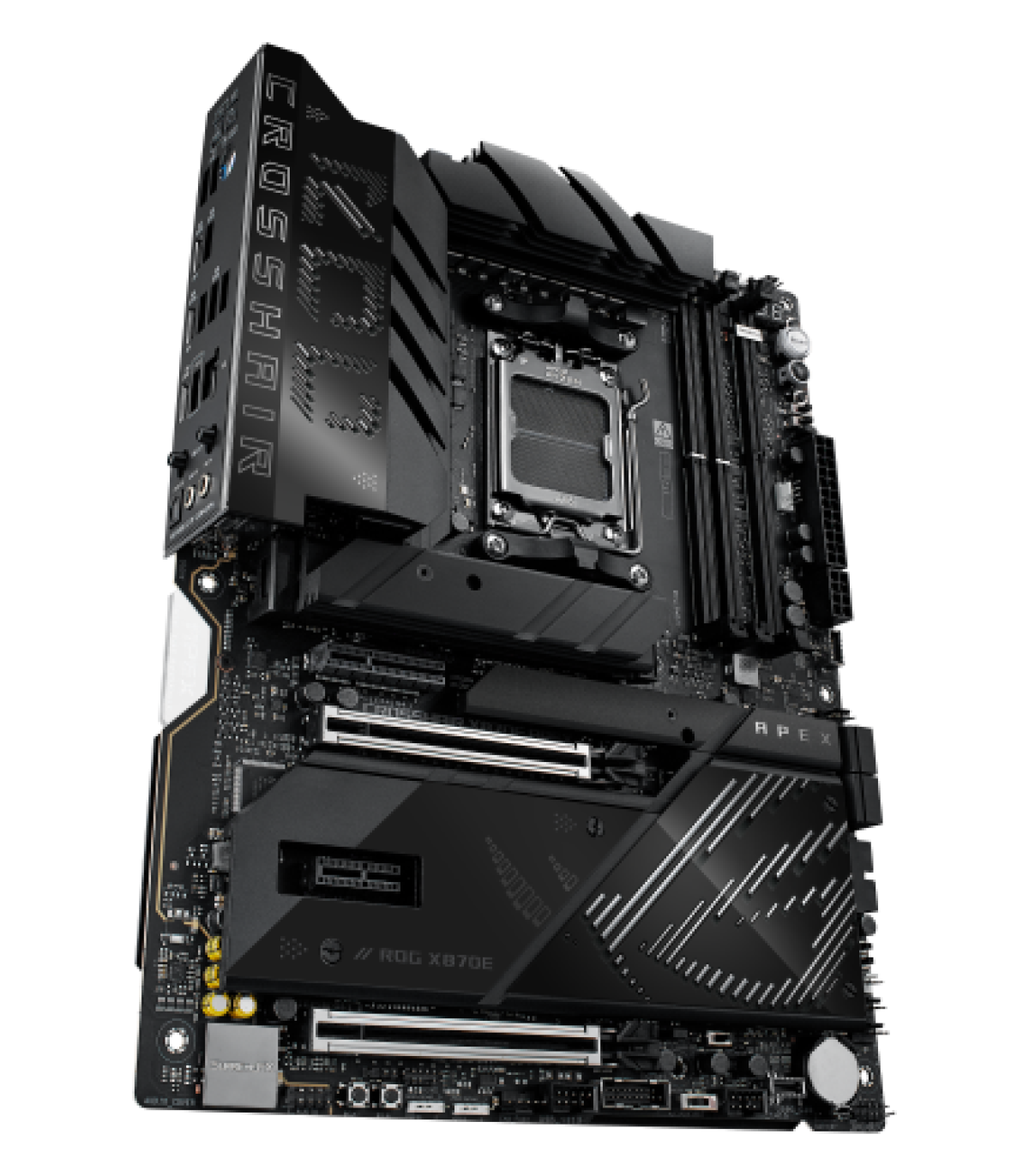 ASUS ROG CROSSHAIR X870E APEX. Fabricante de procesador: AMD, Socket de procesador: Zócalo AM5, Procesador compatible: AMD Ryzen 7000 Series, AMD Ryzen 8000 Series, AMD Ryzen 9000 Series. tipos de memoria compatibles: DDR5-SDRAM, Memoria interna máxima: 128 GB, Tipo de ranuras de memoria: DIMM. Interfaces de disco de almacenamiento soportados: M.2, SATA III, Tipos de unidades de almacenamiento admitidas: HDD & SSD, Niveles RAID: 0, 1, 5, 10. Tipo de interfaz ethernet: 5 Gigabit Ethernet, Estándar Wi-Fi: Wi-Fi 7 (802.11be), Wi-Fi estándares: Wi-Fi 7 (802.11be). Componente para: PC, Factor de forma: ATX, Familia del chipset: AMD