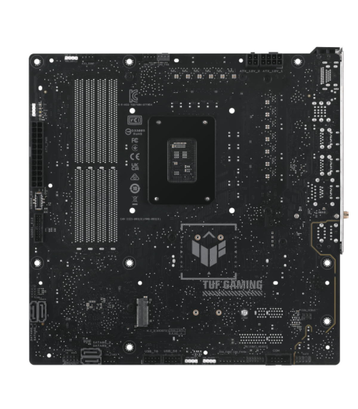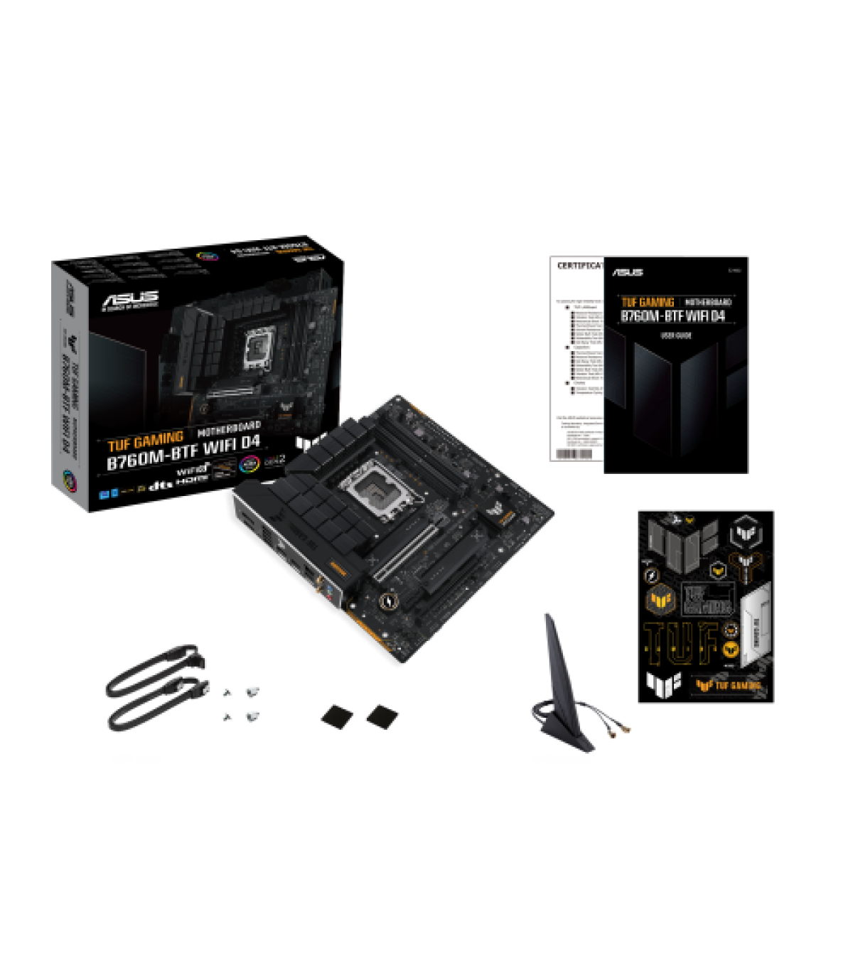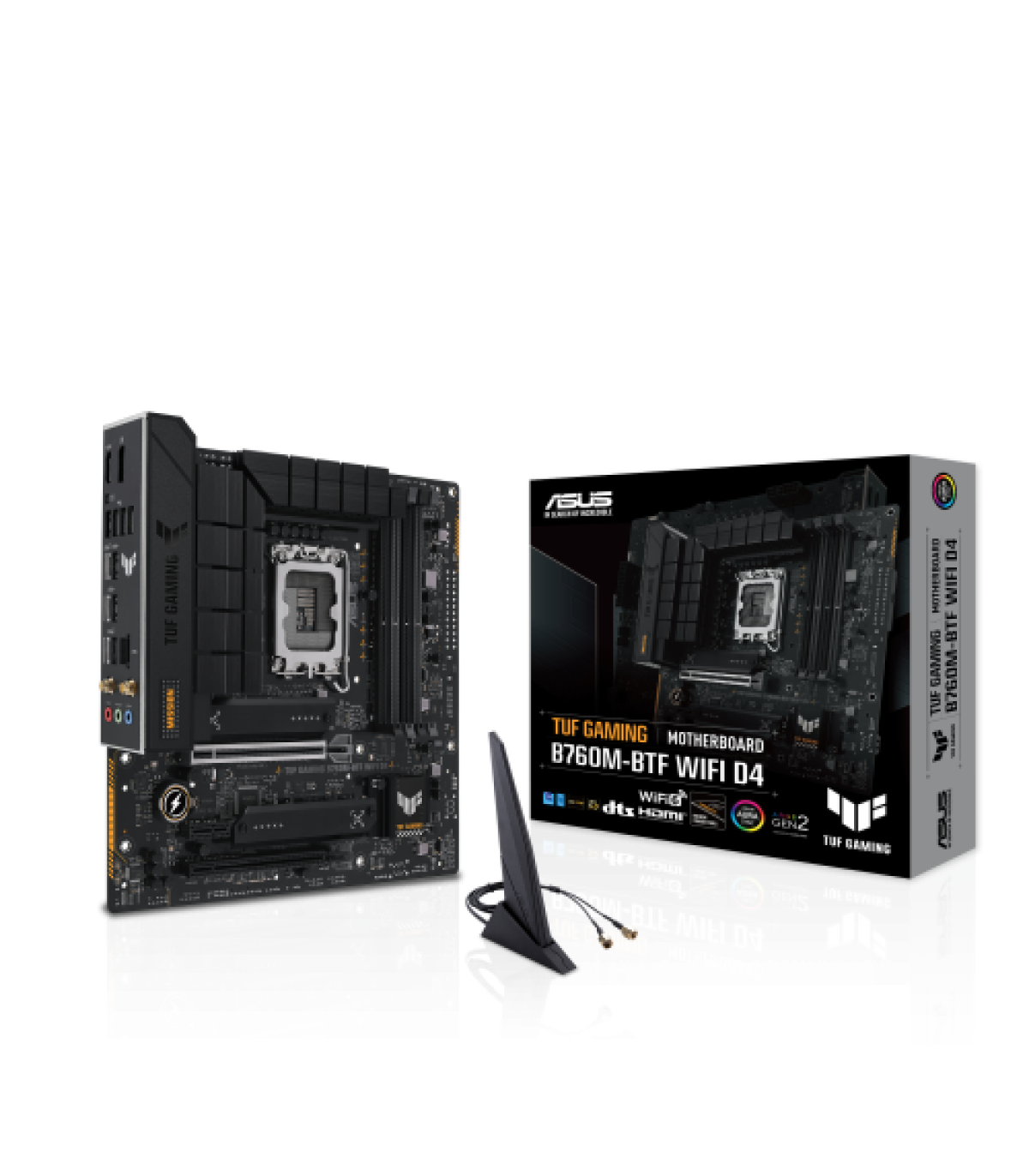 ASUS TUF GAMING B760M-BTF WIFI D4. Fabricante de procesador: Intel, Socket de procesador: LGA 1700, Procesador compatible: Intel® Celeron®, Intel® Core™ i3, Intel® Core™ i5, Intel® Core™ i7, Intel® Core™ i9,.... tipos de memoria compatibles: DDR4-SDRAM, Memoria interna máxima: 128 GB, Tipo de ranuras de memoria: DIMM. Interfaces de disco de almacenamiento soportados: M.2, SATA III, Tipos de unidades de almacenamiento admitidas: HDD & SSD, Niveles RAID: 0, 1, 5, 10. Tipo de interfaz ethernet: 2.5 Gigabit Ethernet, Estándar Wi-Fi: Wi-Fi 6 (802.11ax), Wi-Fi estándares: 802.11a, 802.11b, 802.11g, Wi-Fi 4 (802.11n), Wi-Fi 5 (802.11ac), Wi-Fi 6 (802.11ax). Componente para: PC, Factor de forma: micro ATX, Familia del chipset: Intel