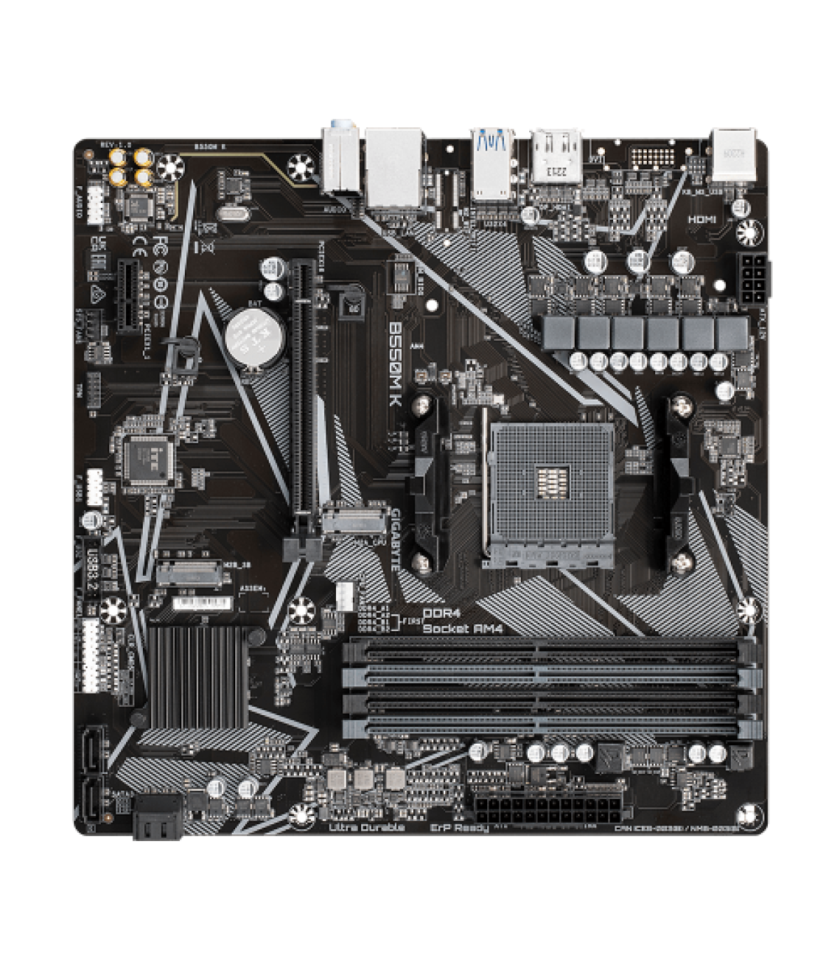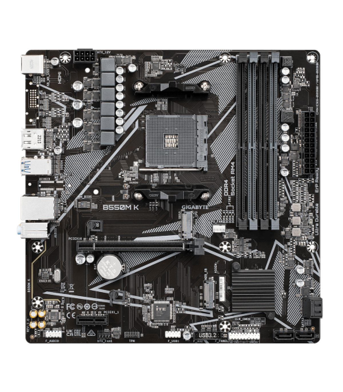 Gigabyte B550M K 1.0. Fabricante de procesador: AMD, Socket de procesador: Zócalo AM4, Procesador compatible: AMD Ryzen™ 5. tipos de memoria compatibles: DDR4-SDRAM, Memoria interna máxima: 128 GB, Tipo de ranuras de memoria: DIMM. Interfaces de disco de almacenamiento soportados: M.2, PCI Express 3.0, PCI Express 4.0, SATA, Tipos de unidades de almacenamiento admitidas: SSD, Niveles RAID: 0, 1, 10. Graphics chipset: AMD, Máxima resolución: 5120 x 2880 Pixeles. Tipo de interfaz ethernet: Gigabit Ethernet