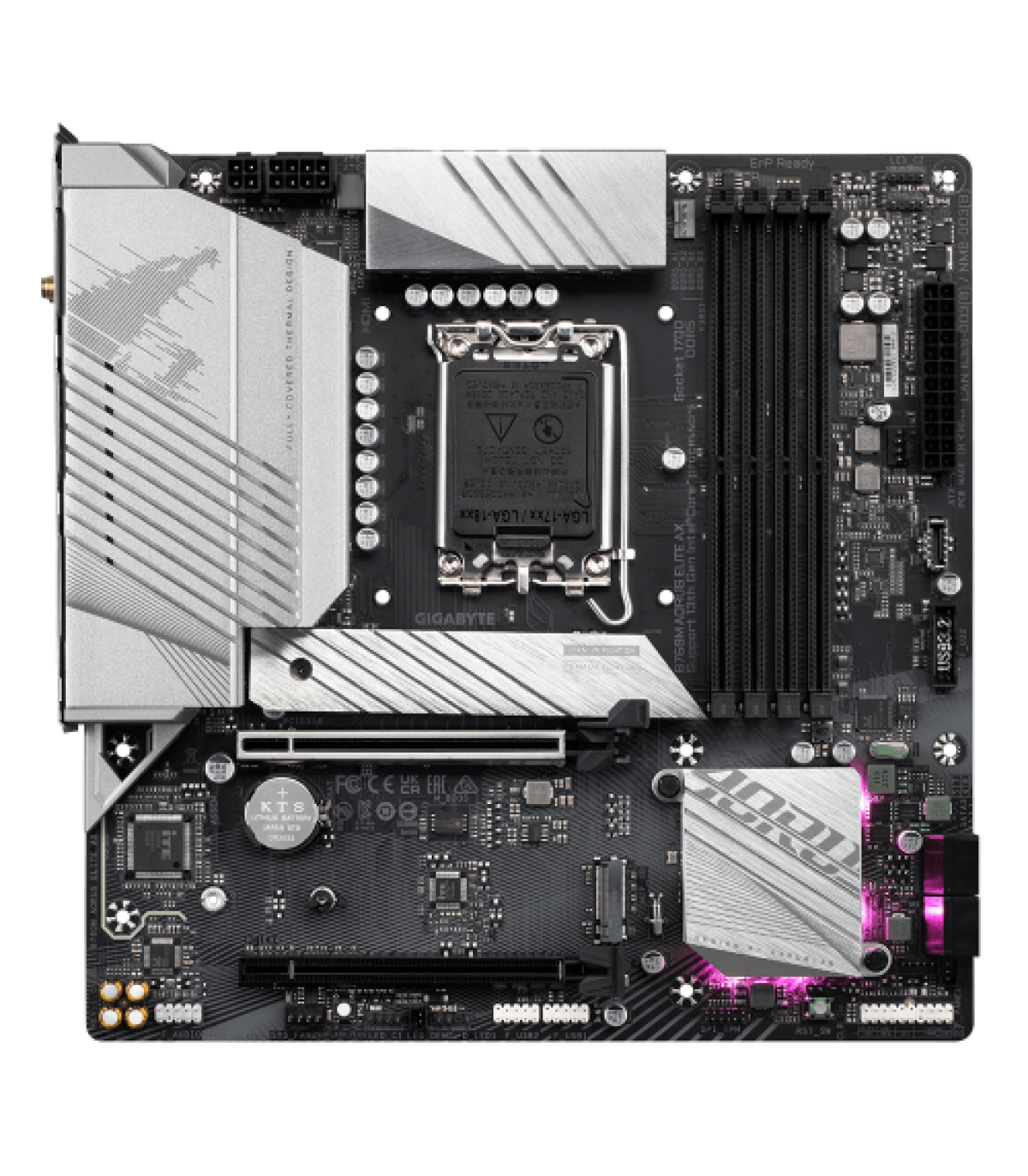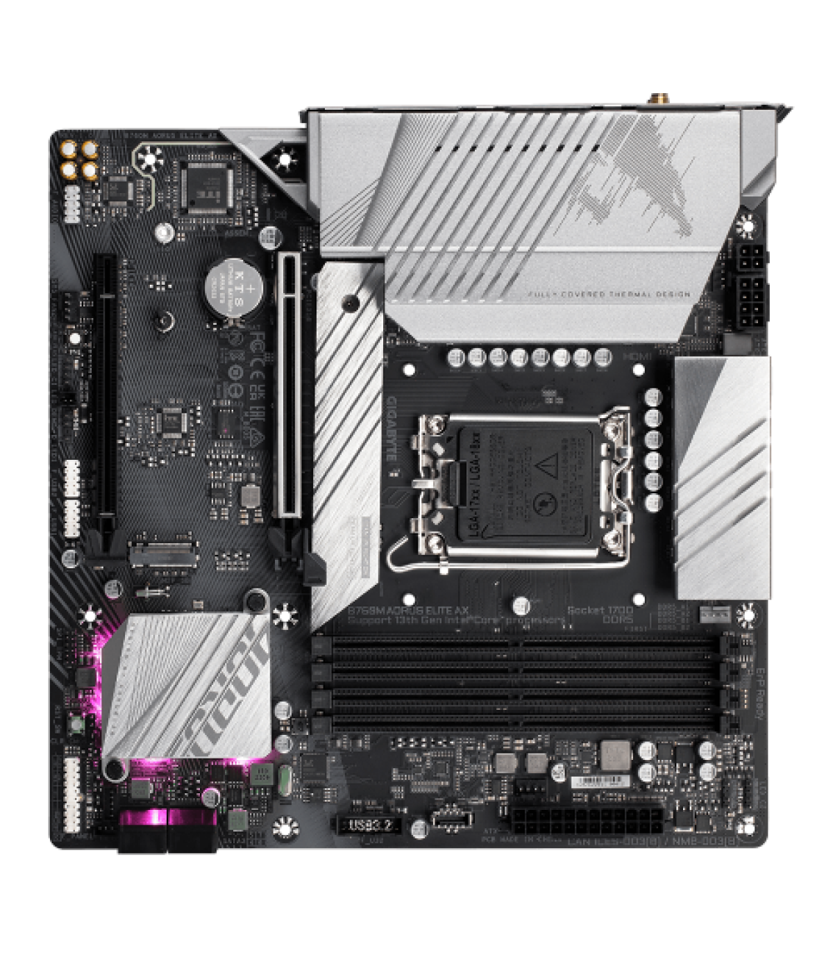 Gigabyte B760M AORUS ELITE AX. Fabricante de procesador: Intel, Socket de procesador: LGA 1700, Procesador compatible: Intel® Celeron®, Intel® Core™ i3, Intel® Core™ i5, Intel® Core™ i7, Intel® Core™ i9,.... tipos de memoria compatibles: DDR5-SDRAM, Memoria interna máxima: 128 GB, Tipo de ranuras de memoria: DIMM. Interfaces de disco de almacenamiento soportados: M.2, SATA III, Tipos de unidades de almacenamiento admitidas: HDD & SSD, Niveles RAID: 0, 1, 5, 10. Soporte para proceso paralelo: CrossFireX, Máxima resolución: 4096 x 2304 Pixeles. Tipo de interfaz ethernet: 2.5 Gigabit Ethernet, 5 Gigabit Ethernet, Estándar Wi-Fi: Wi-Fi 6E (802.11ax), Wi-Fi estándares: 802.11a, 802.11b, 802.11g, Wi-Fi 4 (802.11n), Wi-Fi 5 (802.11ac), Wi-Fi 6 (802.11ax), Wi-Fi 6E...