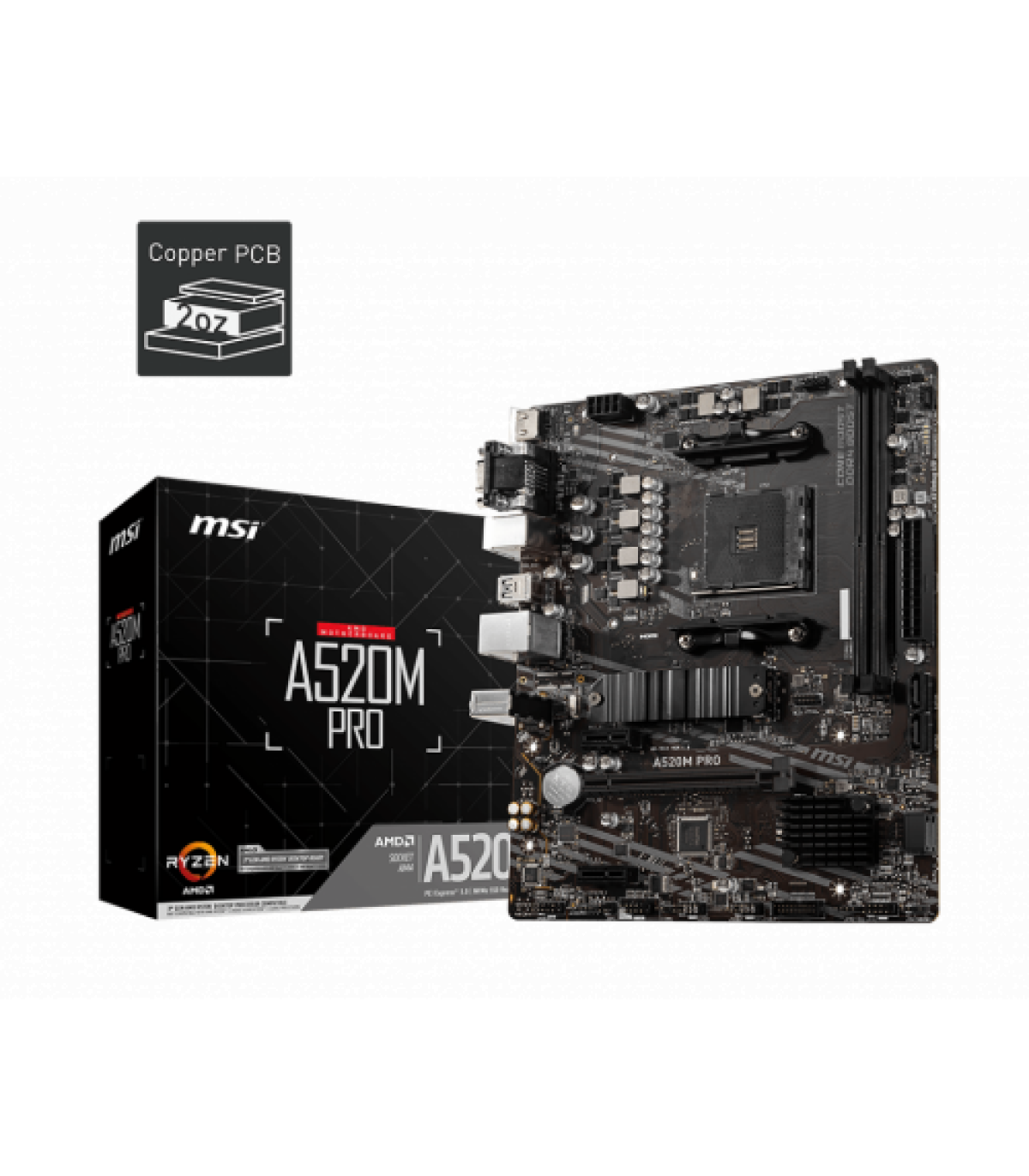 MSI A520M PRO. Fabricante de procesador: AMD, Socket de procesador: Zócalo AM4, Procesador compatible: AMD Ryzen 3 3rd Gen, 3rd Generation AMD Ryzen 5, 3rd Generation AMD Ryzen 7, 3rd Generation AMD.... tipos de memoria compatibles: DDR4-SDRAM, Tipo de ranuras de memoria: DIMM, Velocidades de reloj de memoria soportadas: 1866,2133,2400,2667,2800,2933,3000,3066,3200,3466,3600,3733,3866,4000,4133,4266,4400,4466 MHz. Interfaces de disco de almacenamiento soportados: PCI Express 3.0, SATA, Tipos de unidades de almacenamiento admitidas: HDD & SSD. Máxima resolución: 4096 x 2160 Pixeles. Tipo de interfaz ethernet: Gigabit Ethernet, Controlador LAN: Realtek 8111H