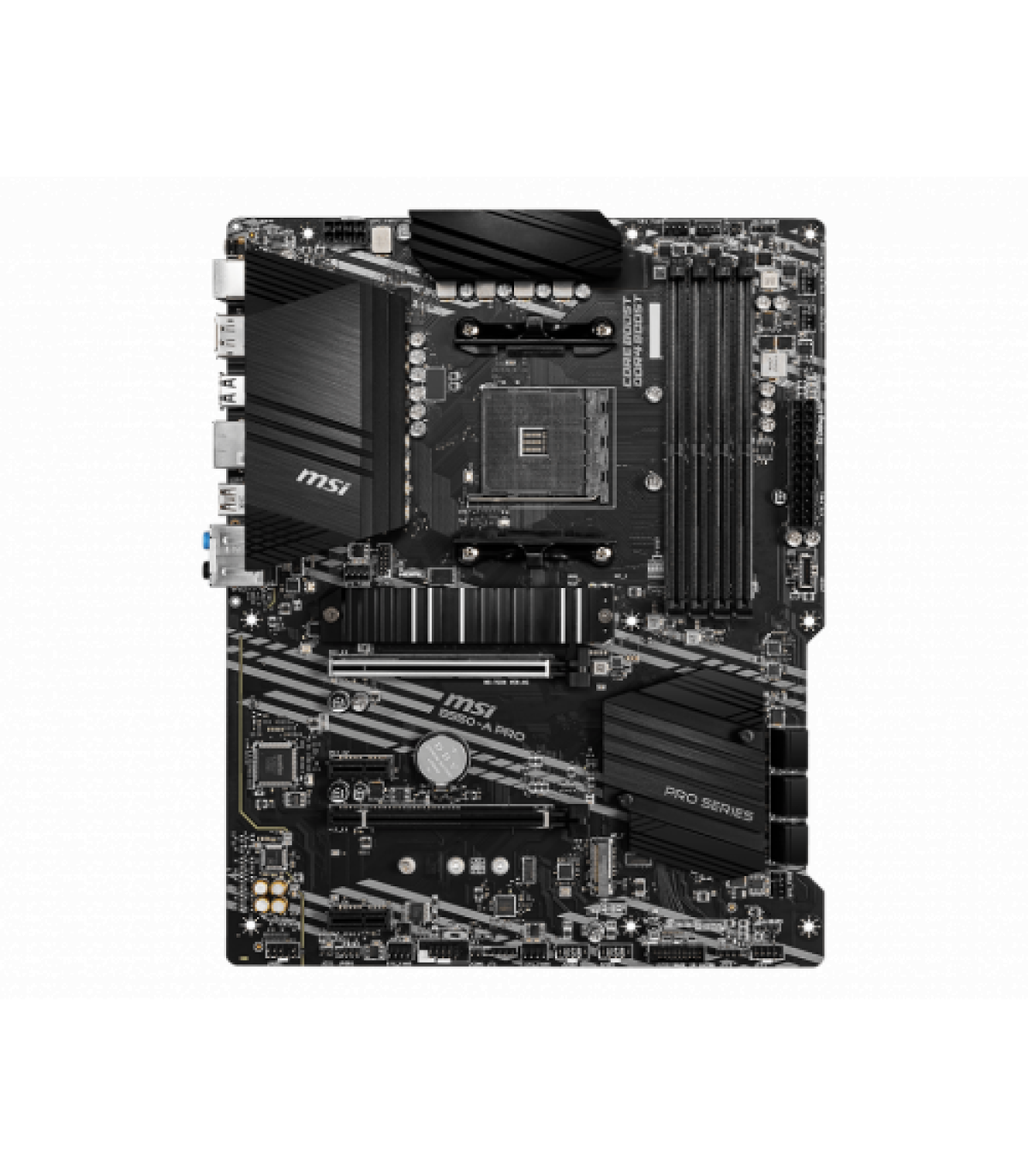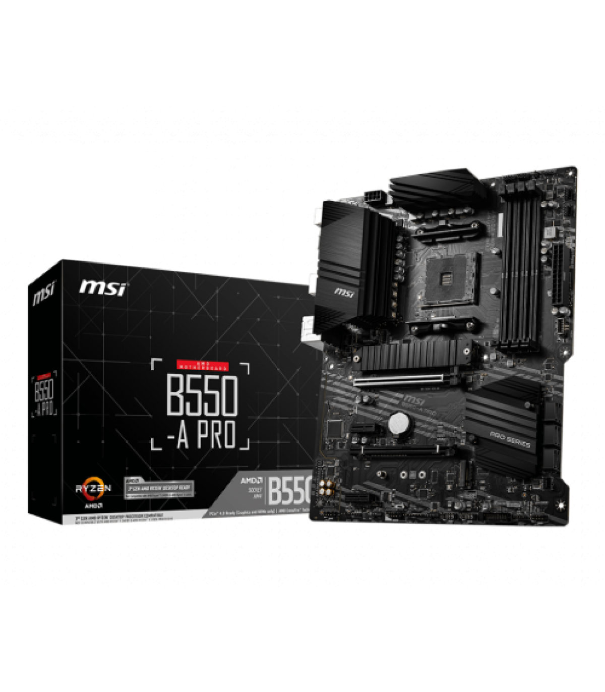 MSI B550-A PRO. Fabricante de procesador: AMD, Socket de procesador: Zócalo AM4, Procesador compatible: AMD Ryzen 3 3rd Gen, 3rd Generation AMD Ryzen 5, 3rd Generation AMD Ryzen 7, 3rd Generation AMD.... tipos de memoria compatibles: DDR4-SDRAM, Tipo de ranuras de memoria: DIMM, Velocidades de reloj de memoria soportadas: 1866,2133,2400,2667,2800,2933,3000,3066,3200,3466,3600,3733,3866,4000,4133,4266,4400,4800 MHz. Interfaces de disco de almacenamiento soportados: Serial ATA III, Tipos de unidades de almacenamiento admitidas: HDD & SSD. Soporte para proceso paralelo: 2-Way CrossFireX, Memoria máxima de adaptador de gráficos: 16000 MB, Máxima resolución: 4096 x 2160 Pixeles. Tipo de interfaz ethernet: Gigabit Ethernet, Controlador LAN: Realtek 8111H
