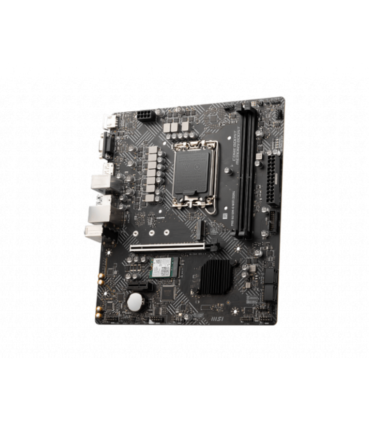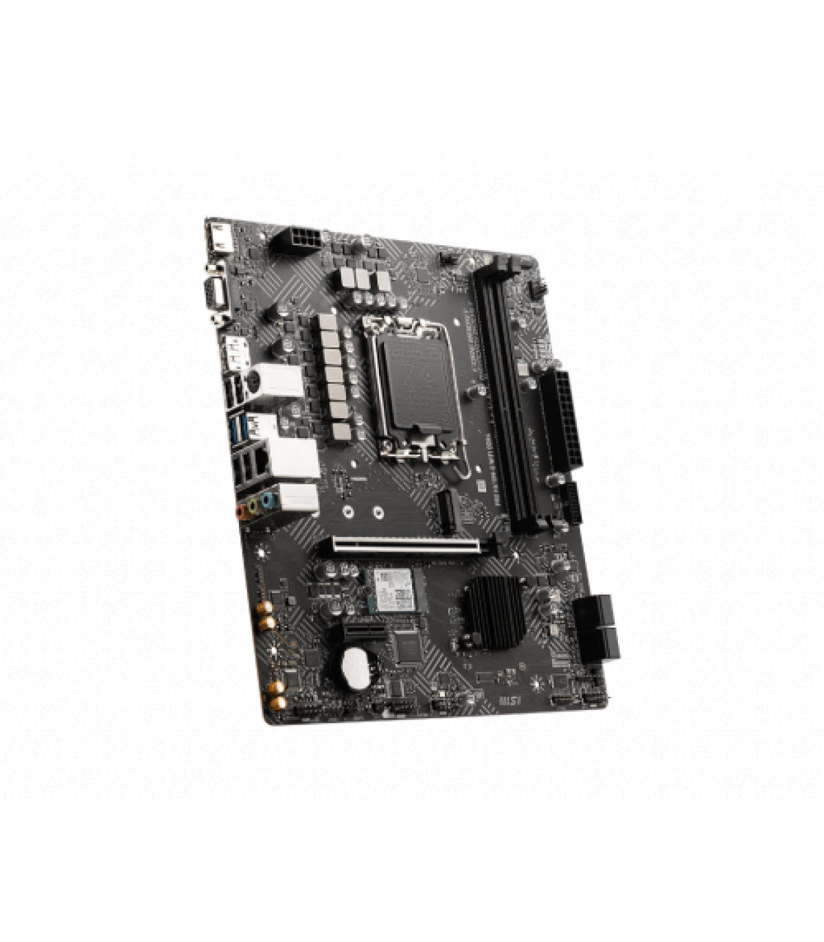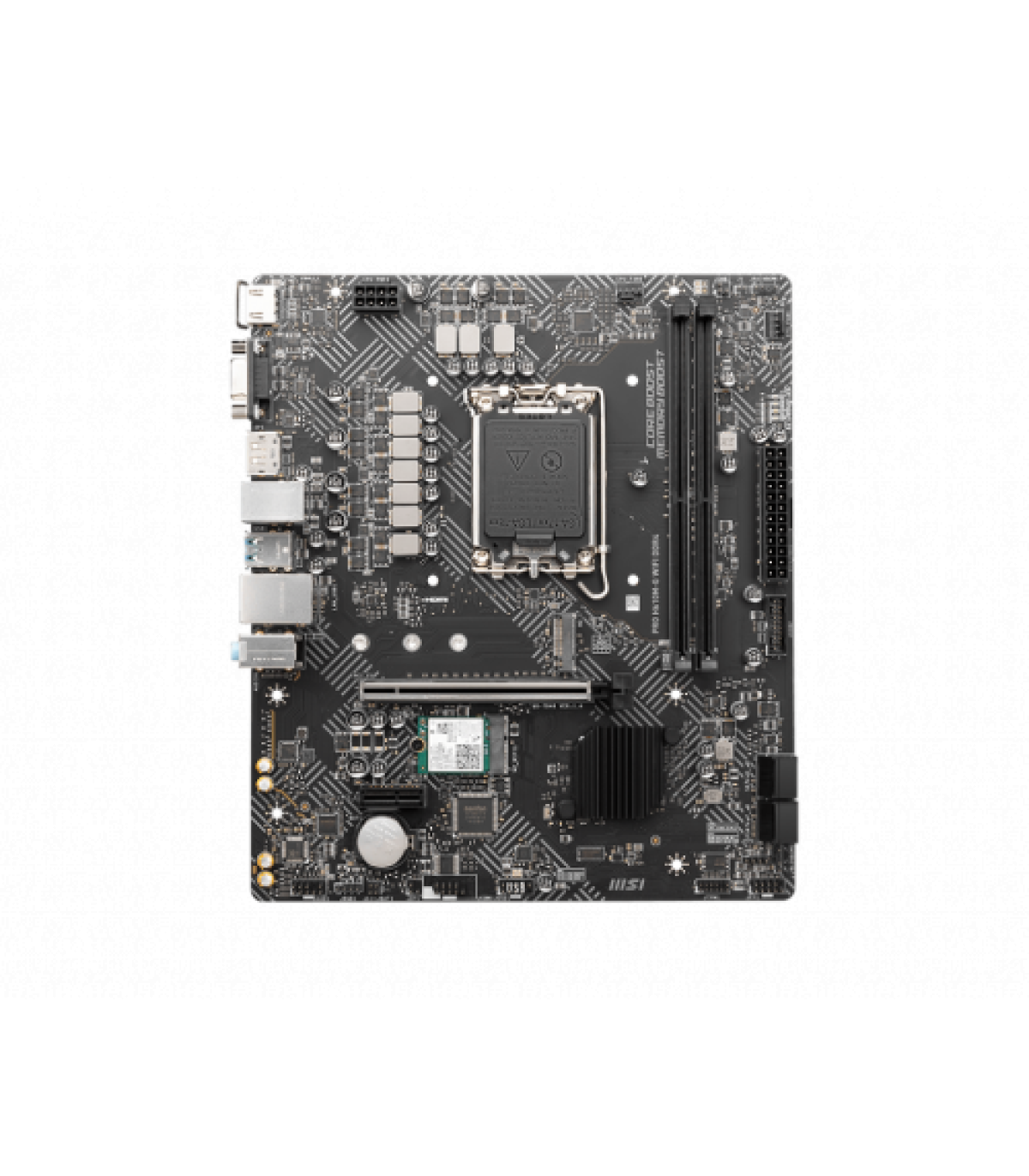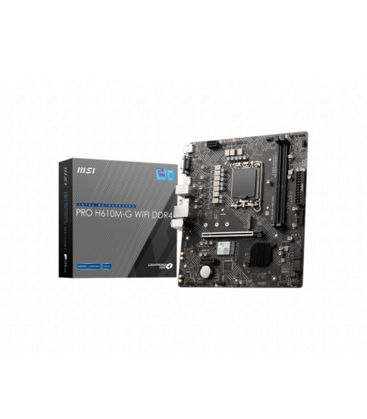 MSI PRO H610M-G WIFI DDR4. Fabricante de procesador: Intel, Socket de procesador: LGA 1700, Procesador compatible: Intel® Celeron®, Intel® Pentium®, Intel® Pentium® Gold. tipos de memoria compatibles: DDR4-SDRAM, Memoria interna máxima: 64 GB, Tipo de ranuras de memoria: DIMM. Interfaces de disco de almacenamiento soportados: M.2, SATA III, Tipos de unidades de almacenamiento admitidas: SSD, Niveles RAID: 0, 1, 5, 10. Tipo de interfaz ethernet: Gigabit Ethernet, Estándar Wi-Fi: Wi-Fi 5 (802.11ac), Wi-Fi estándares: 802.11a, 802.11b, 802.11g, Wi-Fi 4 (802.11n), Wi-Fi 5 (802.11ac). Componente para: PC, Factor de forma: micro ATX, Familia del chipset: Intel