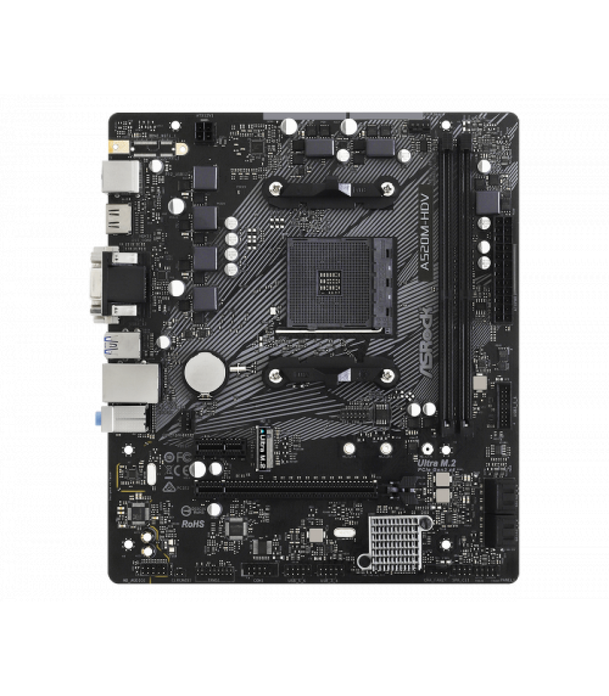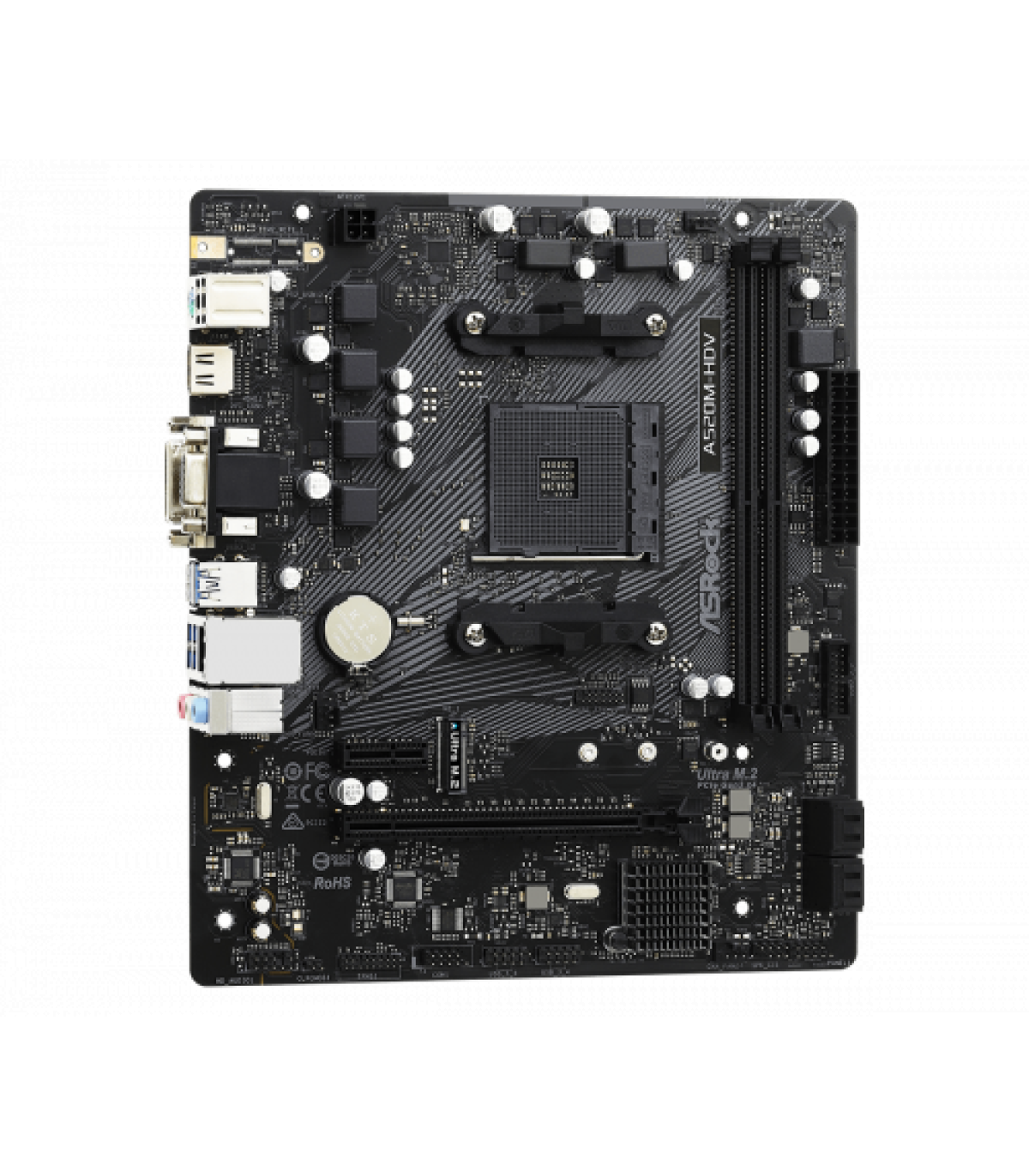 Asrock A520M-HDV. Fabricante de procesador: AMD, Socket de procesador: Zócalo AM4, Procesador compatible: AMD Ryzen 3 3rd Gen, 3rd Generation AMD Ryzen 5, 3rd Generation AMD Ryzen 7, 3rd Generation AMD.... tipos de memoria compatibles: DDR4-SDRAM, Tipo de ranuras de memoria: DIMM, Velocidades de reloj de memoria soportadas: 2133,2400,2666,2933,3200,3466,3600,3733,3800,3866,4000,4133,4200,4266,4333,4400,4466,4500,4533 MHz. Interfaces de disco de almacenamiento soportados: M.2, Serial ATA III. Graphics chipset: AMD, Adaptador gráfico: Radeon Vega. Tipo de interfaz ethernet: Gigabit Ethernet, Controlador LAN: Realtek RTL8111H