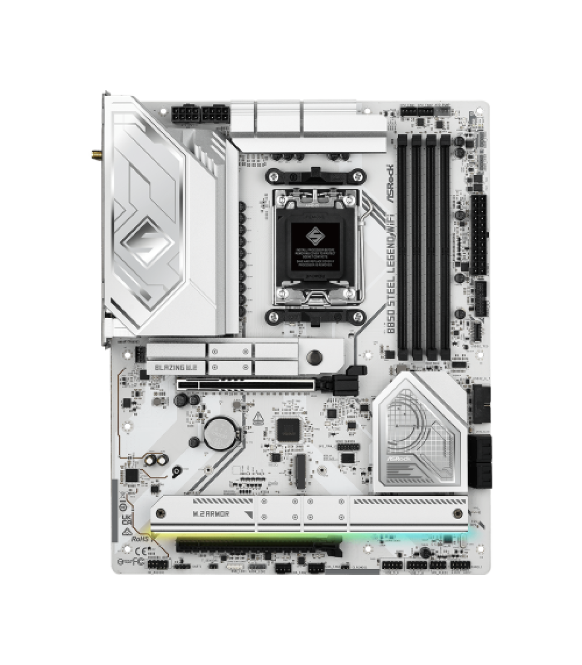 Asrock B850 Steel Legend WiFi. Fabricante de procesador: AMD, Socket de procesador: Zócalo AM5, Procesador compatible: AMD Ryzen 7000 Series, AMD Ryzen 8000 Series, AMD Ryzen 9000 Series. tipos de memoria compatibles: DDR5-SDRAM, Memoria interna máxima: 256 GB, Tipo de ranuras de memoria: DIMM. Interfaces de disco de almacenamiento soportados: PCI Express 4.0, PCI Express 5.0, SATA III, Tipos de unidades de almacenamiento admitidas: HDD & SSD, Niveles RAID: 0, 1, 10. Máxima resolución: 3840 x 2160 Pixeles. Conector USB: USB tipo A, USB Tipo C