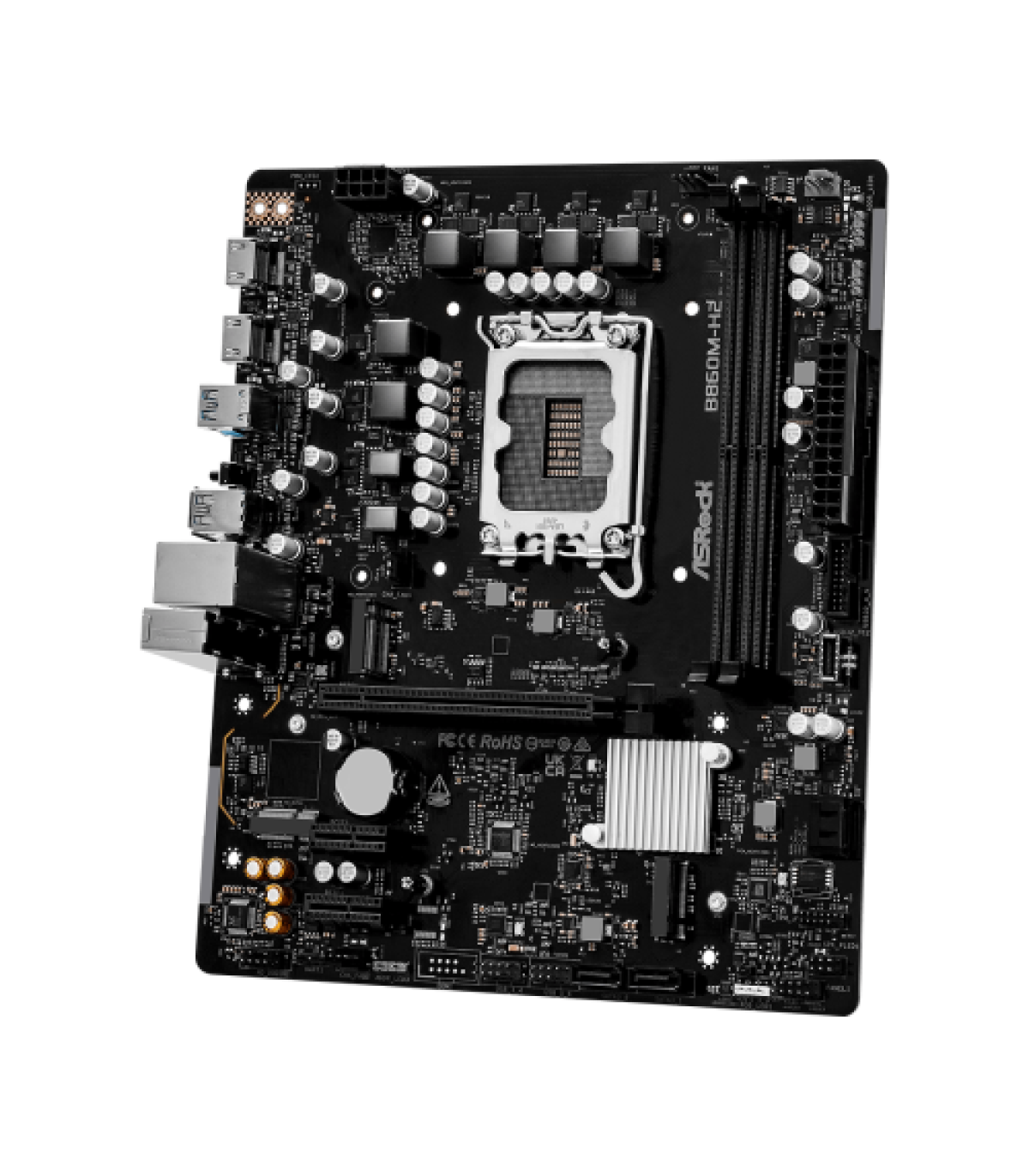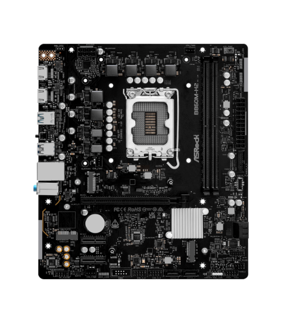 Asrock B860M-H2. Fabricante de procesador: Intel, Socket de procesador: LGA 1851 (Socket V1), Procesador compatible: Intel Core Ultra (Series 2). tipos de memoria compatibles: DDR5-SDRAM, Memoria interna máxima: 128 GB, Tipo de ranuras de memoria: DIMM. Interfaces de disco de almacenamiento soportados: M.2, SATA III, Tipos de unidades de almacenamiento admitidas: HDD & SSD, Niveles RAID: 0, 1, 5, 10. Tipo de interfaz ethernet: Gigabit Ethernet, Controlador LAN: Realtek RTL8111H. Componente para: PC, Factor de forma: micro ATX, Familia del chipset: Intel