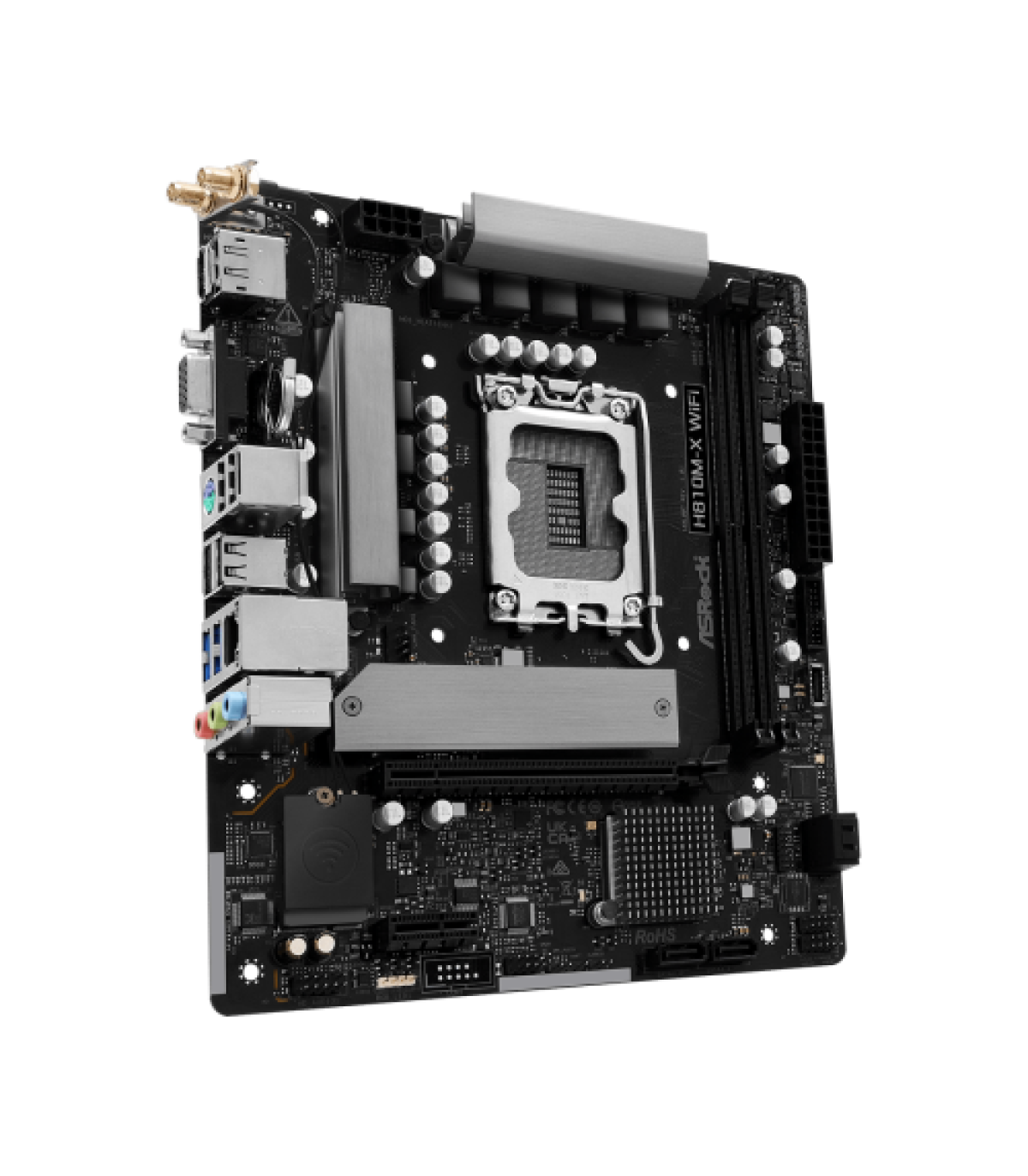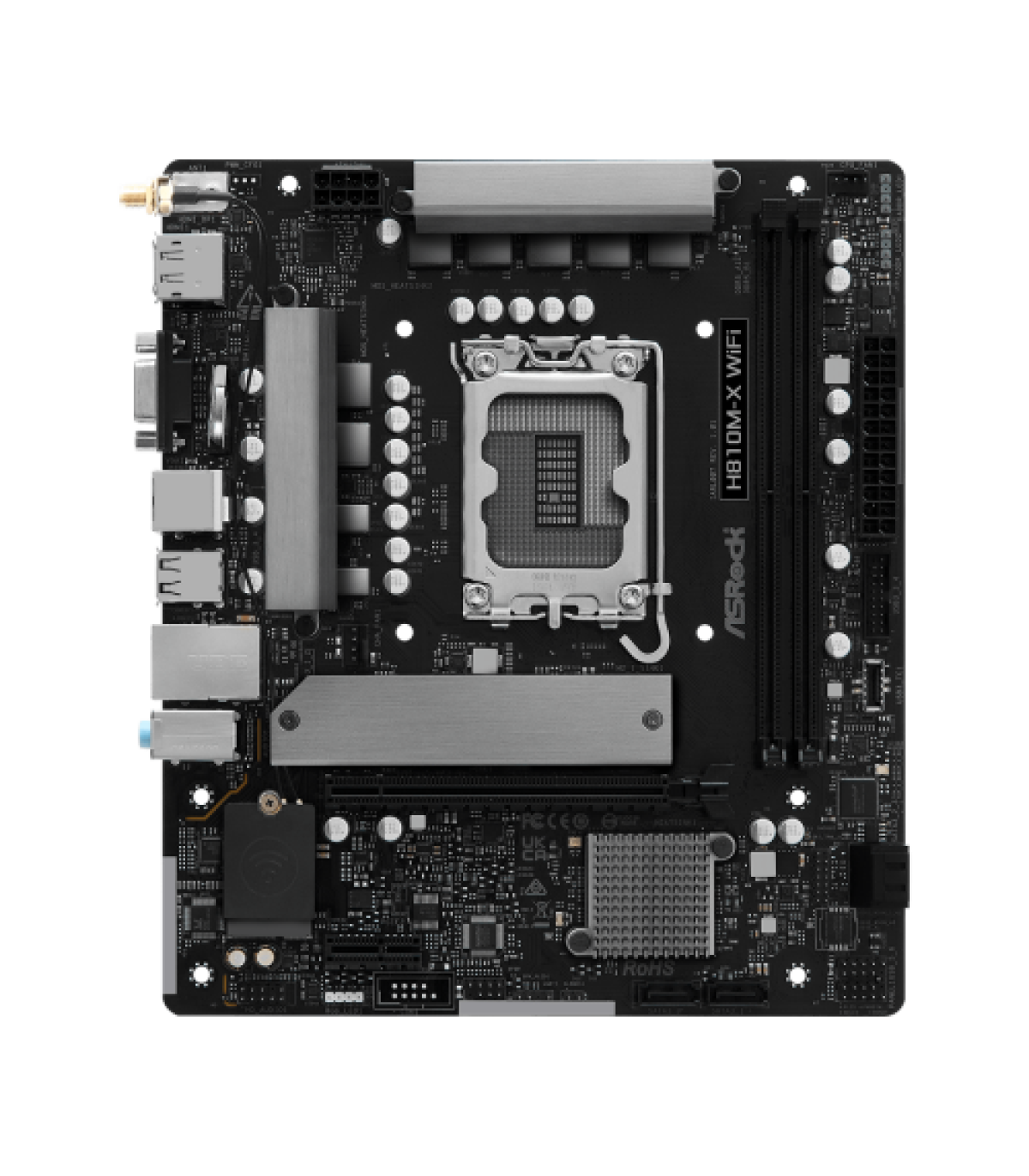 Asrock H810M-X WiFi. Fabricante de procesador: Intel, Socket de procesador: LGA 1851 (Socket V1), Procesador compatible: Intel Core Ultra (Series 2). tipos de memoria compatibles: DDR5-SDRAM, Memoria interna máxima: 128 GB, Tipo de ranuras de memoria: DIMM. Interfaces de disco de almacenamiento soportados: M.2, SATA III, Tipos de unidades de almacenamiento admitidas: HDD & SSD. Tipo de interfaz ethernet: 2.5 Gigabit Ethernet, Controlador LAN: Dragon RTL8125BG, Estándar Wi-Fi: Wi-Fi 5 (802.11ac). Componente para: PC, Factor de forma: micro ATX, Familia del chipset: Intel