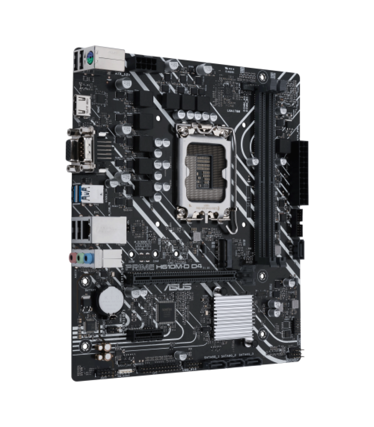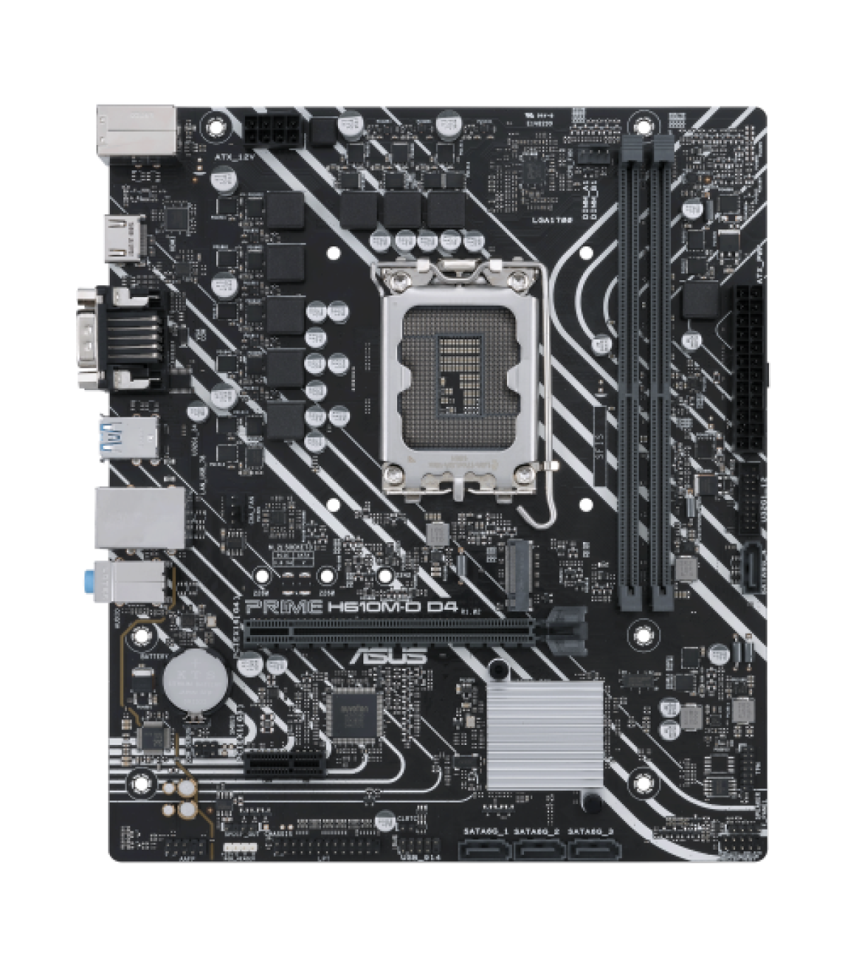 ASUS PRIME H610M-D D4. Fabricante de procesador: Intel, Socket de procesador: LGA 1700, Procesador compatible: Intel® Celeron®, Intel® Core™ i3, Intel Core i5, Intel Core i7, Intel Core i9, Intel®.... tipos de memoria compatibles: DDR4-SDRAM, Memoria interna máxima: 64 GB, Tipo de ranuras de memoria: DIMM. Interfaces de disco de almacenamiento soportados: M.2,SATA, Tipos de unidades de almacenamiento admitidas: HDD & SSD. Tipo de interfaz ethernet: Gigabit Ethernet. Componente para: PC, Factor de forma: micro ATX, Familia del chipset: Intel