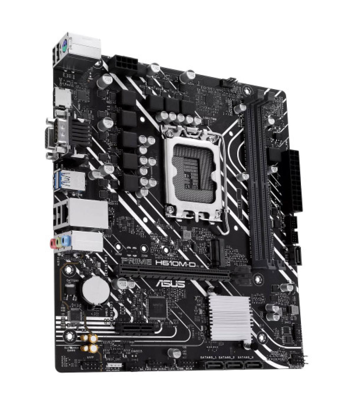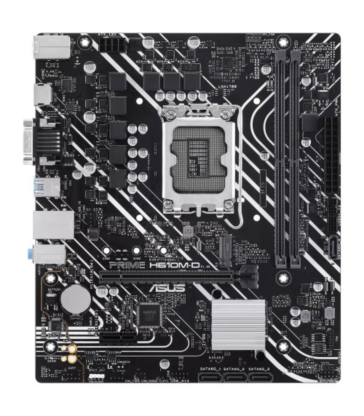La placa base ASUS PRIME H610M-D está diseñada para alojar procesadores Intel de 12ª y 13ª generación en socket LGA 1700. Permitirá montar una configuración para juegos a un coste controlado. Oficina, multimedia, multitarea, creación multimedia ligera, es la solución ideal para diseñar un PC familiar versátil. También admite RAM DDR5, tarjetas gráficas PCI-Express 4.0 16x, discos SATA 6 Gb/s y M.2 PCIe 3. 0 y periféricos USB 3.0. Las placas base ASUS Prime están diseñadas para ayudarte a sacar el máximo partido a tu nuevo procesador Intel Core. Con un diseño robusto y completas soluciones de refrigeración, las placas base de la serie Prime B660 ofrecen a los usuarios una amplia gama de opciones de mejora del rendimiento del hardware a través del software incluido.