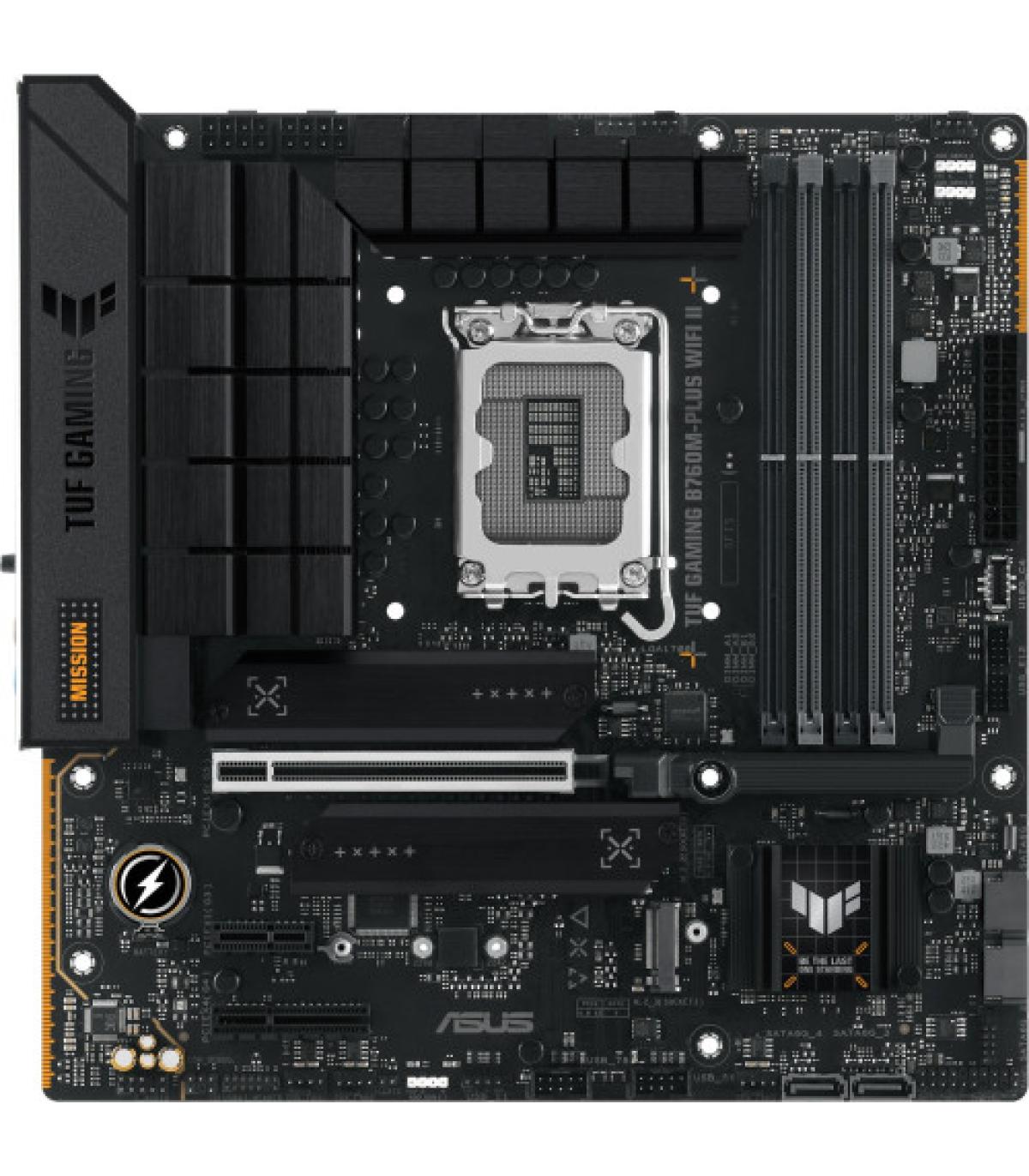 La placa base ASUS TUF GAMING B760M-PLUS WIFI II se basa en el chipset Intel B760 y es compatible con los procesadores Intel®® para Socket 1700 de 13ª y 12ª generación. Tiene cuatro ranuras DIMM DDR5 en modo de doble canal para hasta 192 GB de RAM. Otras características del ASUS TUF GAMING B760M-PLUS WIFI II incluyen una ranura PCIe 5.0 x16, una ranura PCIe 4.0 x4 y una ranura PCIe 4.0 x1. Además, el ASUS TUF GAMING B760M-PLUS WIFI II cuenta con sonido de 8 canales, una interfaz LAN de 2,5 Gigabit, Wi-Fi 6E, Bluetooth 5.3, cuatro puertos SATA3, dos puertos M.2 y varios puertos USB.
