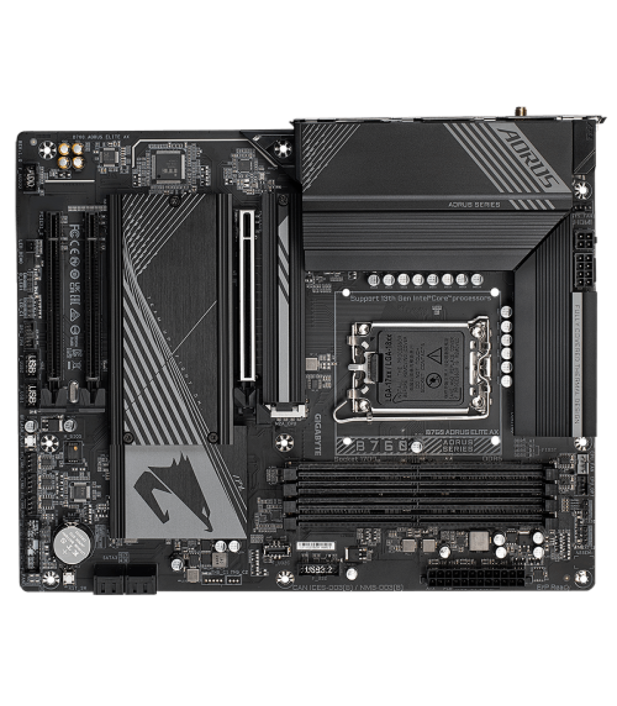 Gigabyte B760 AORUS ELITE AX (rev. 1.0). Fabricante de procesador: Intel, Socket de procesador: LGA 1700, Procesador compatible: Intel® Celeron®, Intel® Core™ i3, Intel® Core™ i5, Intel® Core™ i7, Intel® Core™ i9,.... tipos de memoria compatibles: DDR5-SDRAM, Memoria interna máxima: 128 GB, Tipo de ranuras de memoria: DIMM. Interfaces de disco de almacenamiento soportados: M.2, SATA III, Tipos de unidades de almacenamiento admitidas: HDD & SSD, Niveles RAID: 0, 1, 5, 10. Máxima resolución: 4096 x 2304 Pixeles. Tipo de interfaz ethernet: 2.5 Gigabit Ethernet, 5 Gigabit Ethernet, Estándar Wi-Fi: Wi-Fi 6E (802.11ax), Wi-Fi estándares: 802.11a, 802.11b, 802.11g, Wi-Fi 4 (802.11n), Wi-Fi 5 (802.11ac), Wi-Fi 6 (802.11ax), Wi-Fi 6E...