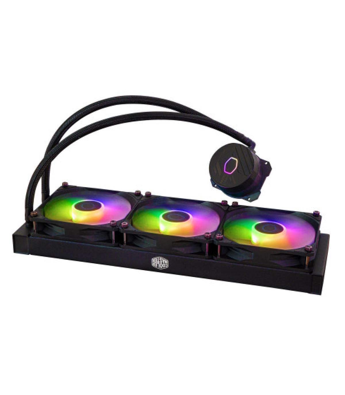 Cooler Master MasterLiquid 360L Core ARGB. Tipo: Kit de refrigeración líquida, Diámetro de ventilador: 12 cm, Velocidad de rotación (mín.): 650 RPM, Velocidad de rotación (máx.): 1750 RPM, Nivel de ruido (alta velocidad): 27,2 dB, Máximo flujo de aire: 71,93 cfm, Presión máxima de aire: 1,86 mmH2O, Tipo de soporte: Rodamiento tipo rifle. Color del producto: Negro